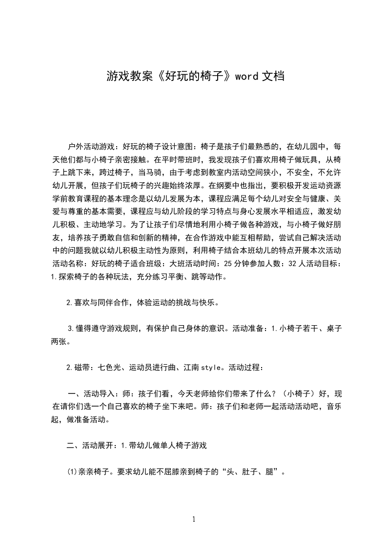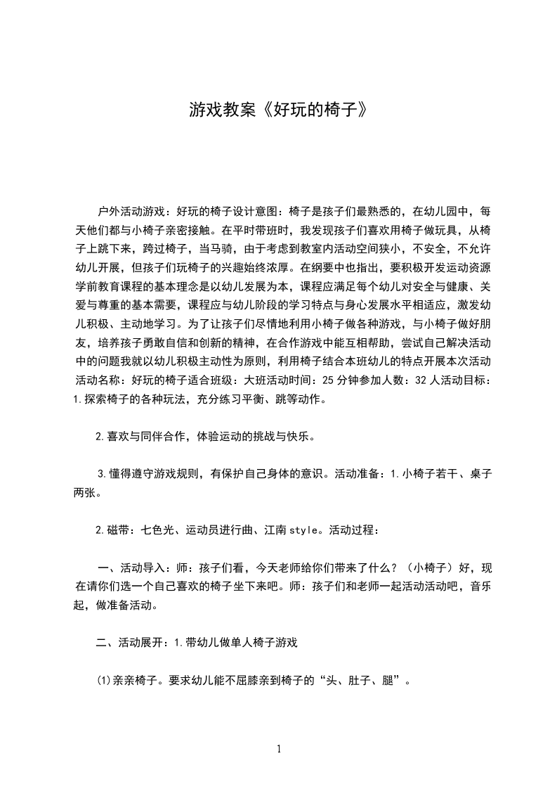 户外活动游戏:好玩的椅子设计意图:椅子是孩子们最熟悉的,在幼儿园中,每天他们都与小椅子亲密接触。在平时带班时,我发现孩子们喜欢用椅子做玩具,从椅子上跳下来,跨过椅子,当马骑,由于考虑到教室内活动空间狭小,不安全,不允许幼儿开展,但孩子们玩椅子的兴趣始终浓厚。在纲要中也指出,要积极开发运动资源。学前教育课程的基本理念是以幼儿发展为本,课程应满足每个幼儿对安全与健康、关爱与尊重的基本需要,课程应与幼儿阶段的学习特点与身心发展水平相适应,激发幼儿积极、主动地学习。为了让孩子们尽情地利用小椅子做各种游戏,与小椅子做好朋友,培养孩子勇敢自信和创新的精神,在合作游戏中能互相帮助,尝试自己解决活动中的问题我就以幼儿积极主动性为原则,利用椅子结合本班幼儿的特点开展本次活动。活动名称:好玩的椅子适合班级:大班活动时间:25分钟参加人数:32人活动目标:1.探索椅子的各种玩法,充分练习平衡、跳等动作。