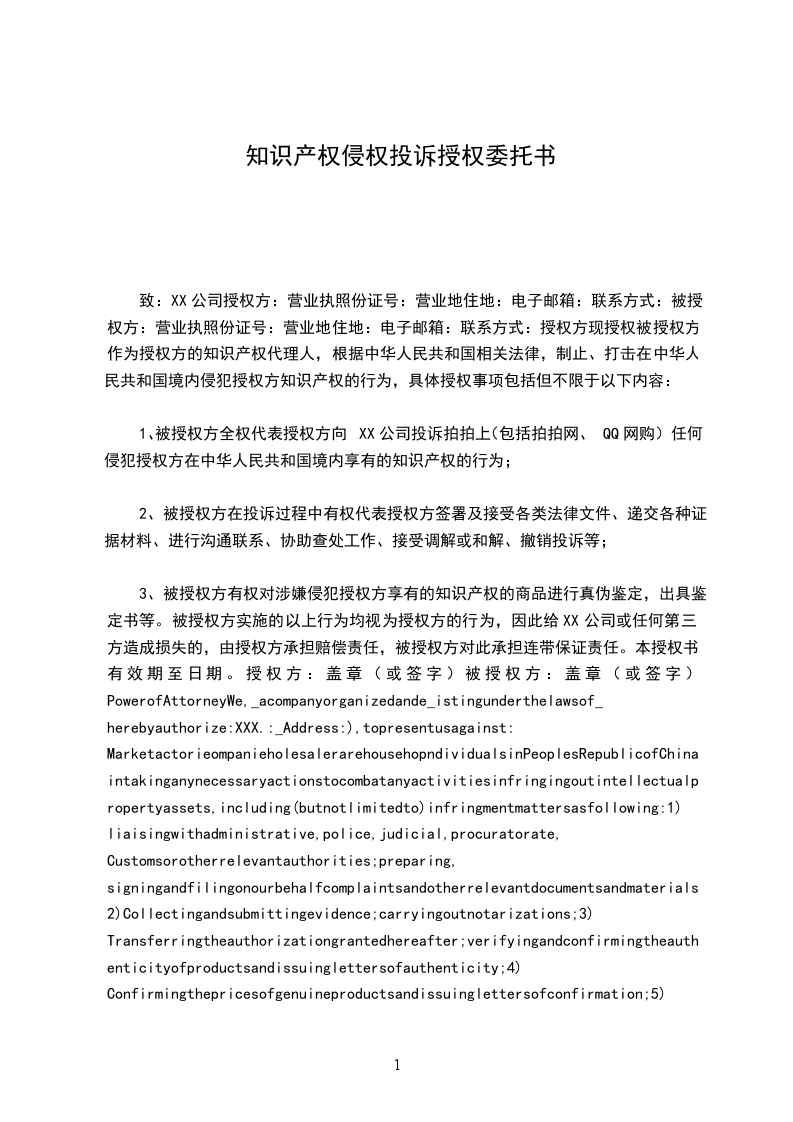 3、被授权方有权对涉嫌侵犯授权方享有的知识产权的商品进行真伪鉴定,出具鉴定书等。被授权方实施的以上行为均视为授权方的行为,因此给XX公司或任何第三方造成损失的,由授权方承担赔偿责任,被授权方对此承担连带保证责任。本授权书有效期至日期。授权方:盖章(或签字)被授权方:盖章(或签字)PowerofAttorneyWe,_acompanyorganizedande_istingunderthelawsof_herebyauthorize:XXX.:_Address:),topresentusagainst:MarketactorieompanieholesalerarehousehopndividualsinPeoplesRepublicofChina,intakinganynecessaryactionstocombatanyactivitiesinfringingoutintellectualpropertyassets,including(butnotlimitedto)infringmentmattersasfollowing:1)liaisingwithadministrative,police,judicial,procuratorate,Customsorotherrelevantauthorities;preparing,signingandfilingonourbehalfcomplaintsandotherrelevantdocumentsandmaterials;2)Collectingandsubmittingevidence;carryingoutnotarizations;3)Transferringtheauthorizationgrantedhereafter;verifyingandconfirmingtheauthenticityofproductsandissuinglettersofauthenticity;4)Confirmingthepricesofgenuineproductsandissuinglettersofconfirmation;5)Participatinginhearingsonourbehalfandhandlingrelevantmatters;6)Collectingonourbehalfdamagesandotherpayments;7)Receivingpunishmentdecisionsandotherdocuments;and8)Takinganyothernecessaryactionstopursuetheliabilities(includingcriminalliabilities)XXX)XXX,ifthereareanydamagesorlossestherebycausedtoTencentoranythirdparty,weshallbeartheliabilityforthewholecompensation,and_theauthorizedparty)XXX)shallbevaliduponsignatureandremainvaliduntil_Signature:Name:Title:Date: