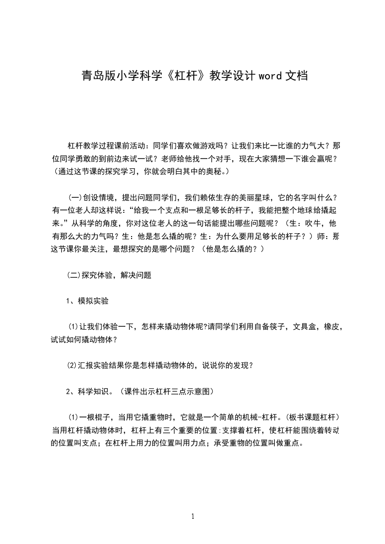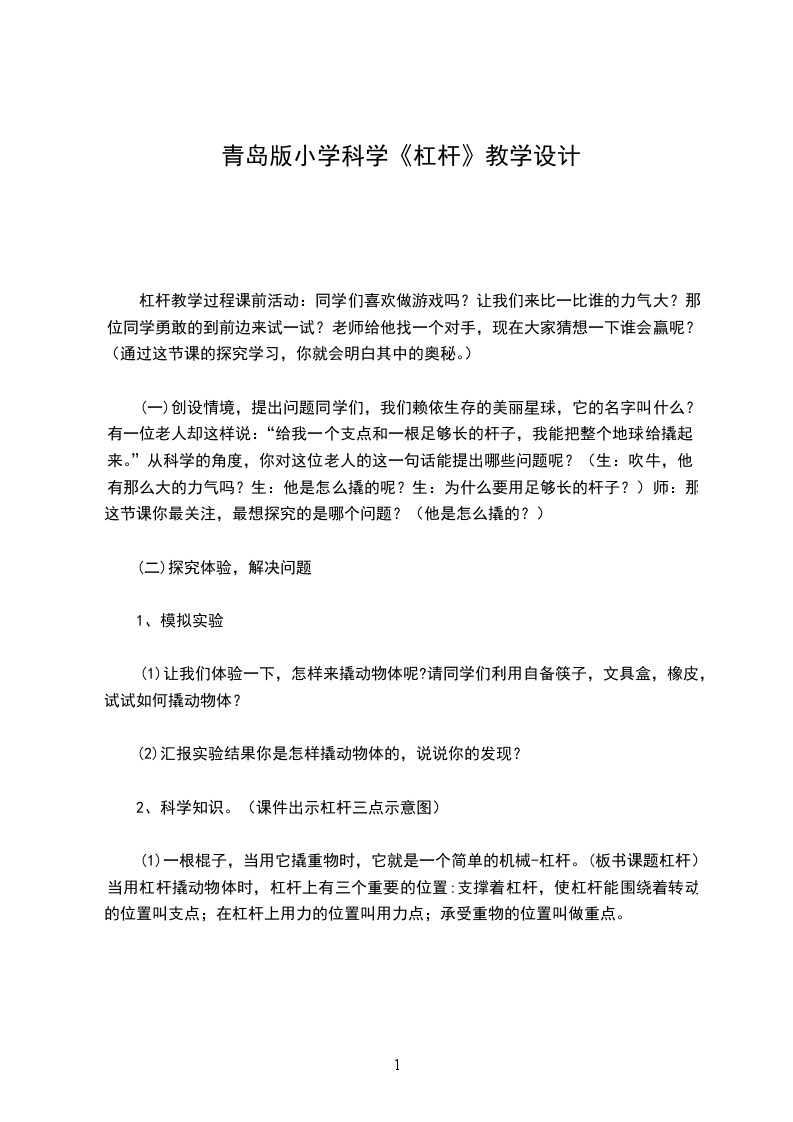 (四)、杠杆在生产生活中的应用师:杠杆在我们的生产和生活中的应用是很广泛的。但是杠杆的外形是可以变化的。同学们想一想生活中那些地方应用了杠杆的原理.生:跷跷板、剪刀、超市的小推车。(说的不错,你非常注意观察。同学们知道的真多,在生活中非常注意观察)(看来,同学们没太注意,那老师也收集了一些生活中的杠杆)师:老师也搜集了一些生活中的杠杆,请看课件出示师出示课件:介绍省力杠杆钳子钳子的这个点相当杠杆的哪个点呢?生:力点、支点、重点师出示课件:介绍省力杠杆起子、羊角锤。师:人划船时,使用的船桨是什么杠杆,生:费力杠杆,师出示课件:天平是什么杠杆?使用它有什么好处?生:天平是不省力不费力的杠杆。使用天平方便称物体质量。介绍费力杠杆镊子师用镊子夹物:镊子的三点在哪里?它是什么杠杆?生:夹物的地方是重点,手的地方是力点,一个头的地方是支点,镊子是费力的杠杆。师:很好!镊子和前面的杠杆不一样,它的力点、重点在支点的同侧。师:杠杆的外形是可以变化的,有的力点、重点在支点的同侧,有的力点、重点在支点的两侧,请同学们课下继续了解杠杆在生产生活中的应用。课件出示:科学家阿XX说过:“给我一个支点,我就能撬起整个地球”你们同意这种观点吗?学生回答:同意拓展活动:不知是在我们的生活中会用到杠杆,人体在许多活动中也会用到杠杆,课下请同学们找一找人体中的杠杆。好,这节课就到这里,下课。