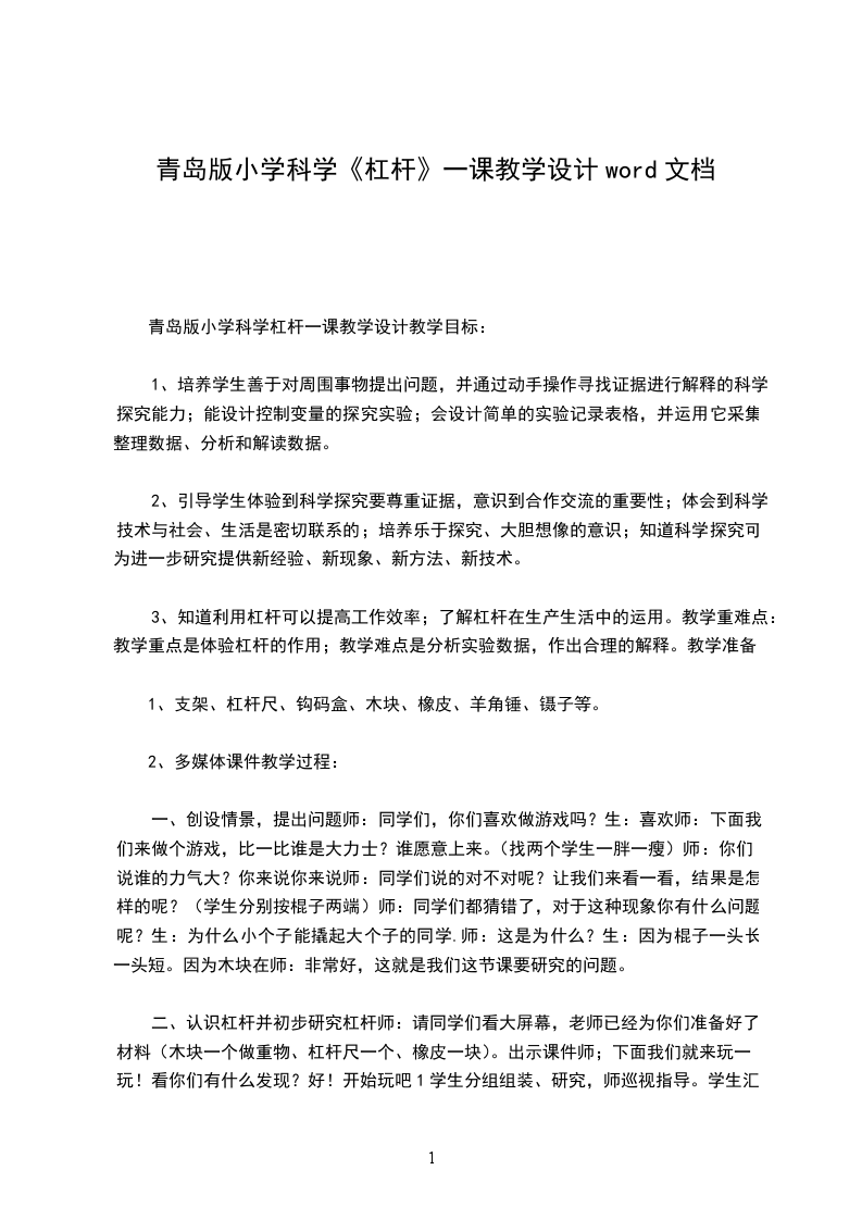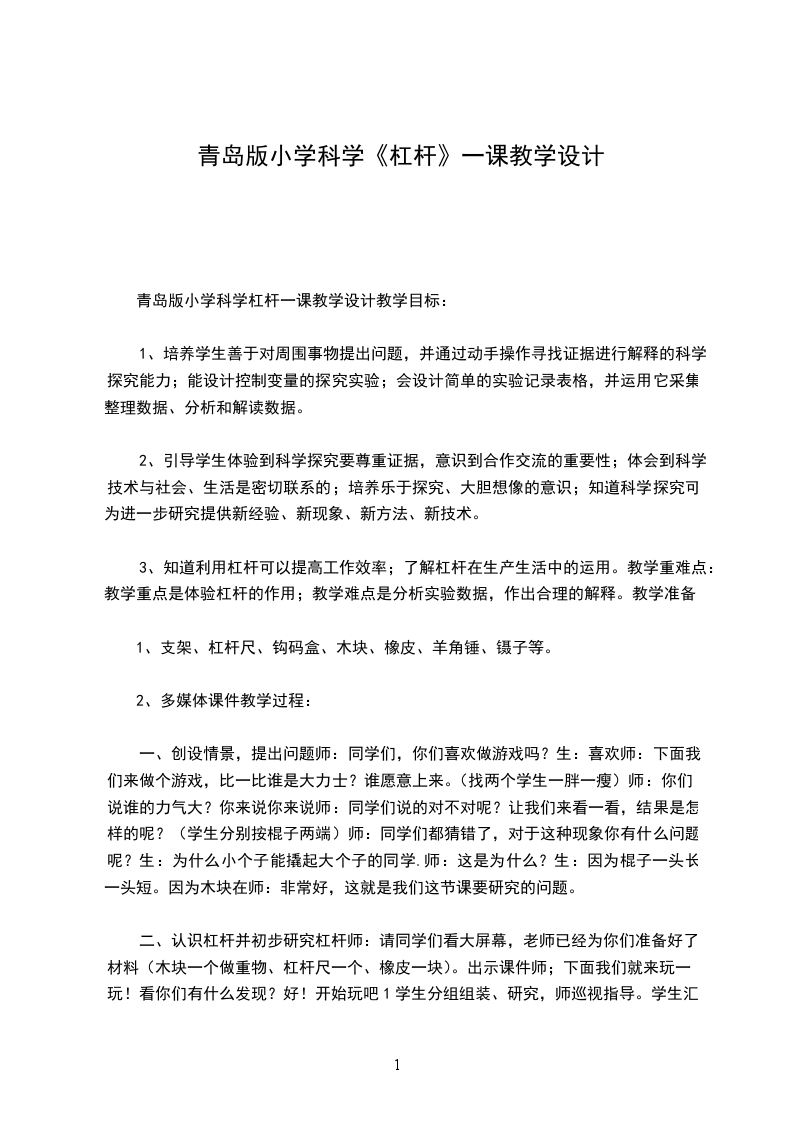 3、知道利用杠杆可以提高工作效率;了解杠杆在生产生活中的运用。教学重难点:教学重点是体验杠杆的作用;教学难点是分析实验数据,作出合理的解释。教学准备: