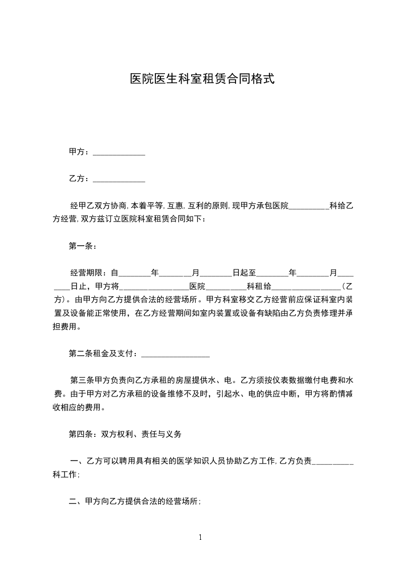 经甲乙双方协商,本着平等,互惠,互利的原则,现甲方承包医院__________科给乙方经营,双方兹订立医院科室租赁合同如下: