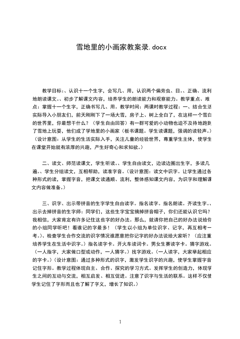 教学目标:、认识十一个生字,会写几、用,认识两个偏旁虫、目。、正确、流利地朗读课文。、初步了解课文内容,培养学生的朗读能力和观察能力。教学重点、难点:掌握十一个生字,正确书写几、用。教学时间:两课时教学过程:一、结合生活实际导入小朋友们,前天刚刚下了一场大雪,房子上、树上全白了,在这样一个雪白的世界里,你最想干什么?(学生自由回答)有一群可爱的小动物也迫不及待地跑到了雪地上玩耍,他们成了学地里的小画家(板书课题。学生读课题,强调的读轻声。)(设计意图:从学生的生活实际入手,关注儿童的经验世界,尊重学生主体,使学生在课堂开始就有浓厚的兴趣,产生好奇心和求知欲。)