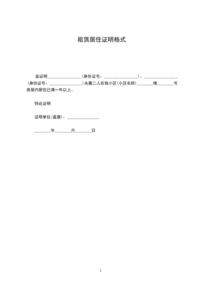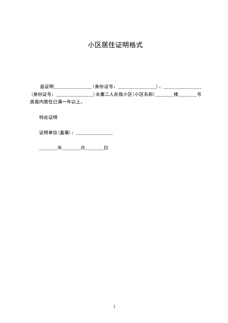 兹证明________________(身份证号:________________)、________________(身份证号:________________)夫妻二人在我小区(小区名称)________楼________号房屋内居住已满一年以上。