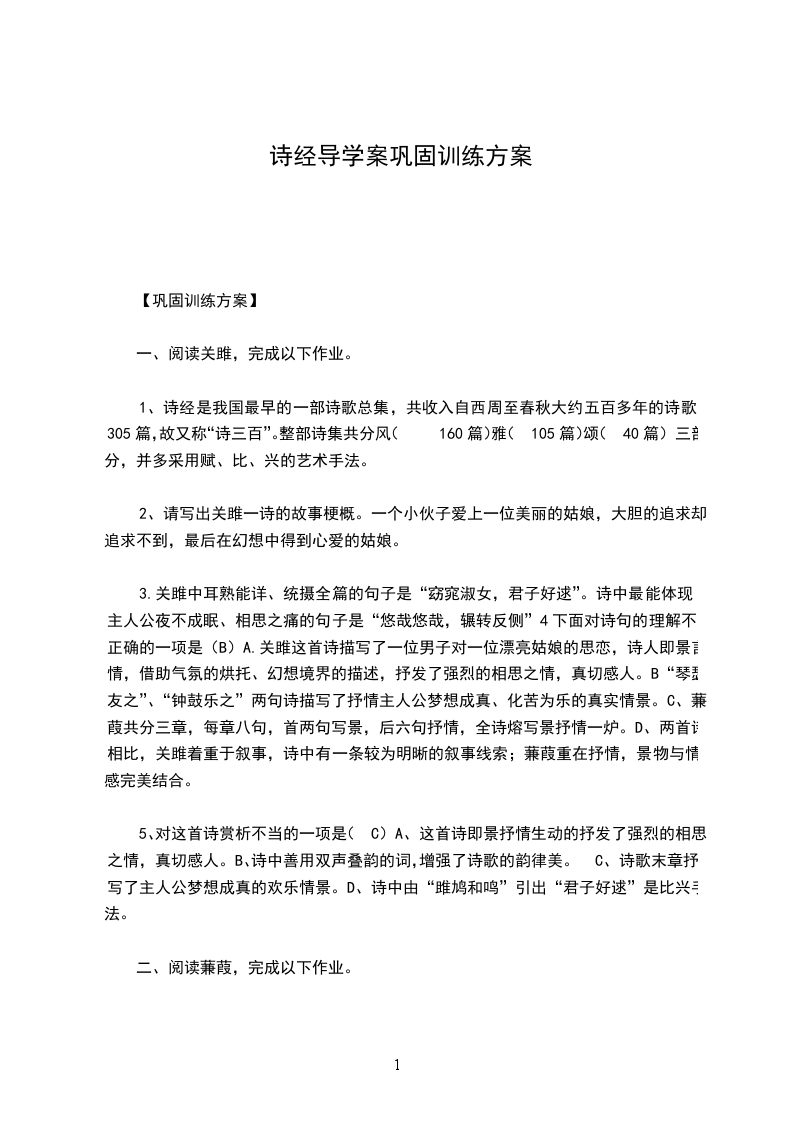 3.关雎中耳熟能详、统摄全篇的句子是“窈窕淑女,君子好逑”。诗中最能体现主人公夜不成眠、相思之痛的句子是“悠哉悠哉,辗转反侧”4下面对诗句的理解不正确的一项是(B)A.关雎这首诗描写了一位男子对一位漂亮姑娘的思恋,诗人即景言情,借助气氛的烘托、幻想境界的描述,抒发了强烈的相思之情,真切感人。B“琴瑟友之”、“钟鼓乐之”两句诗描写了抒情主人公梦想成真、化苦为乐的真实情景。C、蒹葭共分三章,每章八句,首两句写景,后六句抒情,全诗熔写景抒情一炉。D、两首诗相比,关雎着重于叙事,诗中有一条较为明晰的叙事线索;蒹葭重在抒情,景物与情感完美结合。