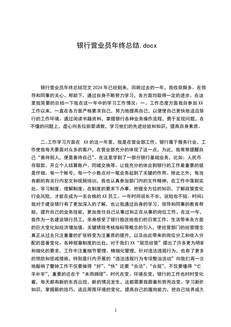 银行营业员年终总结范文2024年已经到来,回顾过去的一年,我收获颇多。在领导和同事的关心、帮助下,通过自身不断努力学习,各方面均取得一定的进步。在这里我简要的总结一下我在这一年中的学习工作情况:一、工作态度方面我自参加XX工作以来,一直在各方面严格要求自己,努力地提高自己,以便使自己更快地适应银行的工作环境。通过阅读书籍资料,掌握银行各种业务操作流程,勇于发现问题,在不懂的问题上,虚心向各位前辈请教,学习他们的先进经验和知识,提高自身素质。