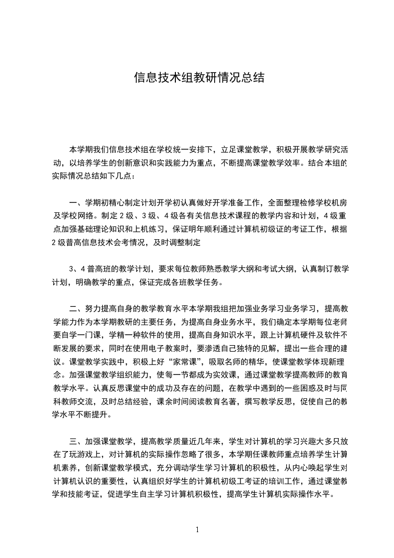 二、努力提高自身的教学教育水平本学期我组把加强业务学习业务学习,提高教学能力作为本学期教研的主要任务,为提高自身业务水平,我们确定本学期每位老师要自学一门课,学精一种软件的使用,提高自身知识水平,跟上计算机硬件及软件不断发展的要求,同时在使用电子教案时,要渗透自己独特的见解,提出一些合理的建议。课堂教学实践中,积极上好“家常课”,吸取名师的精华,使课堂教学体现新理念。加强课堂教学组织能力,使每一节都成为实效课,通过课堂教学提高教师的教育教学水平。认真反思课堂中的成功及存在的问题,在教学中遇到的一些困惑及时与同科教师交流,及时总结经验,课余时间阅读教育名著,撰写教学反思,促使自己的教学水平不断提升。