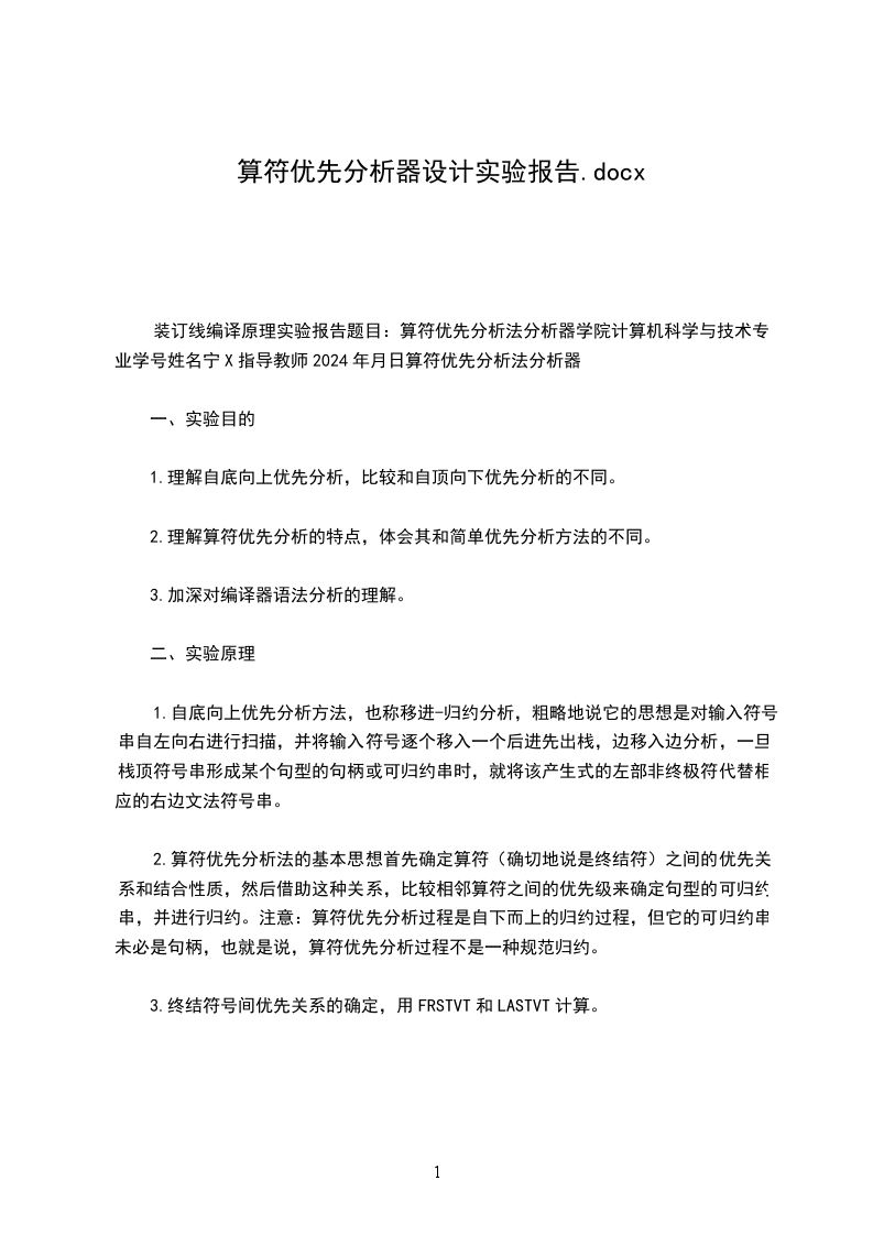 装订线编译原理实验报告题目:算符优先分析法分析器学院计算机科学与技术专业学号姓名宁X指导教师2024年月日算符优先分析法分析器
