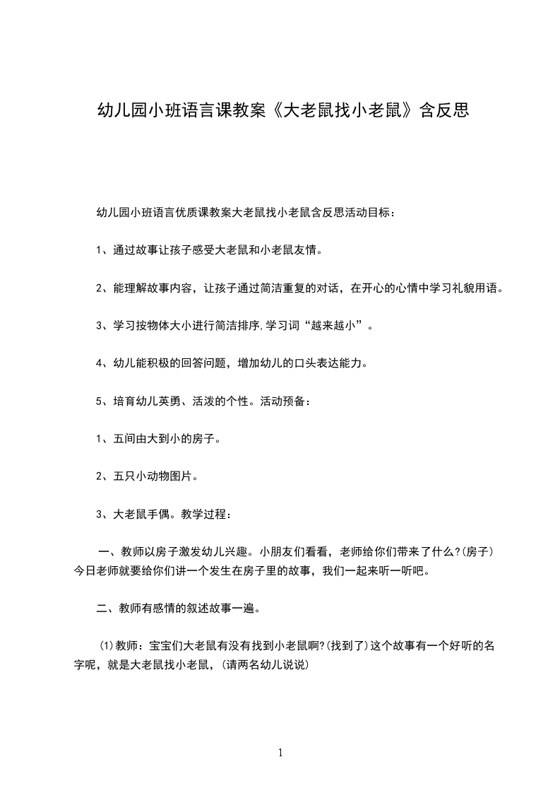 1、教师带领幼儿无动作完整念儿歌两次教师:这首儿歌真有意思,我们一起来完整的念一念。教师:小老鼠说了,要是你们学会了这首儿歌,你们就能去参与他的娶亲大会了!你们想不想去啊?那我们再来念一次!