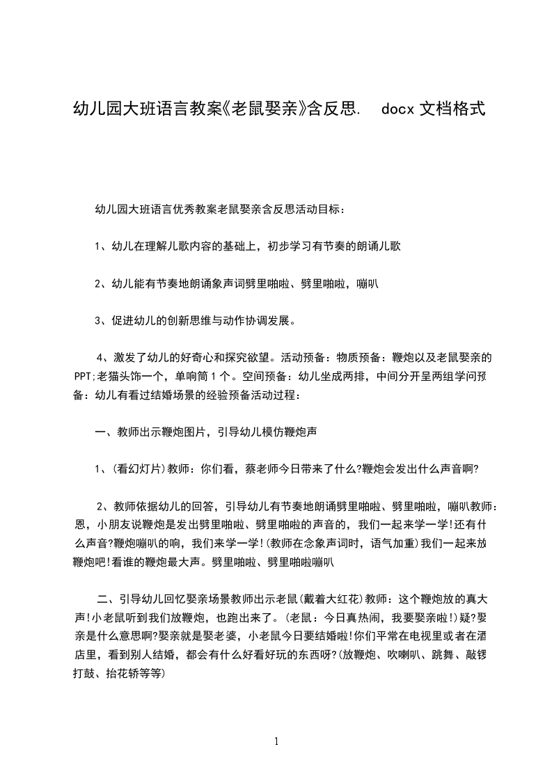 4、激发了幼儿的好奇心和探究欲望。活动预备:物质预备:鞭炮以及老鼠娶亲的PPT;老猫头饰一个,单响筒个。空间预备:幼儿坐成两排,中间分开呈两组学问预备:幼儿有看过结婚场景的经验预备活动过程: