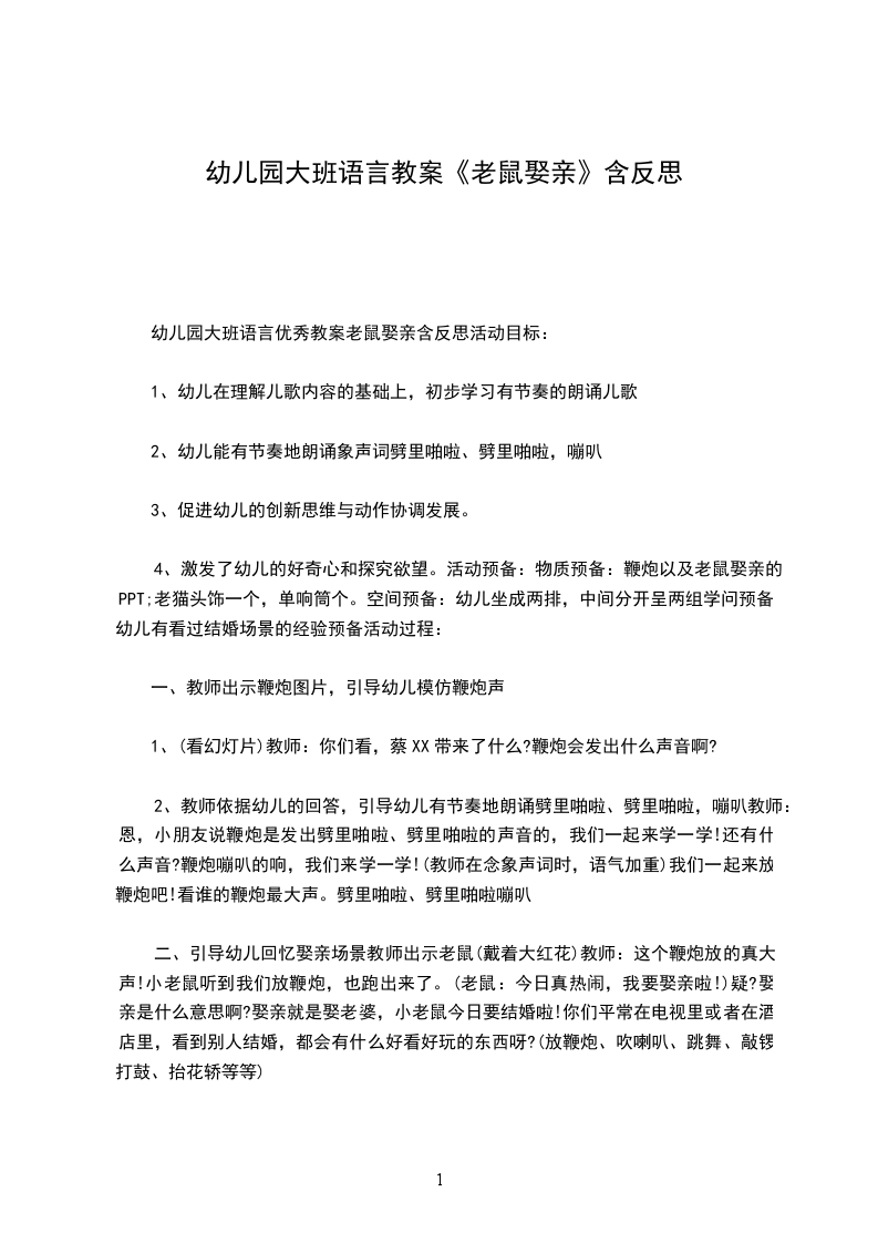 4、师幼共同游玩2-3遍附:儿歌老鼠娶亲八只老鼠抬花轿呀抬花轿,四只老鼠来吹号呀来吹号,两只老鼠放鞭炮呀放鞭炮,劈里啪啦、劈里啪啦,嘣叭!老猫听了还贺喜,恭喜!恭喜!一口一个全吃掉呀全吃掉!活动反思:这首儿歌节奏明显,易理解,读起来朗朗上口,适合大班幼儿学习。猫和老鼠又是幼儿特别喜欢的动物形象,我就幼儿的生活经验(最近结婚的人家比较多,好多幼儿有吃喜酒的经验),设计了这样一个语言活动。