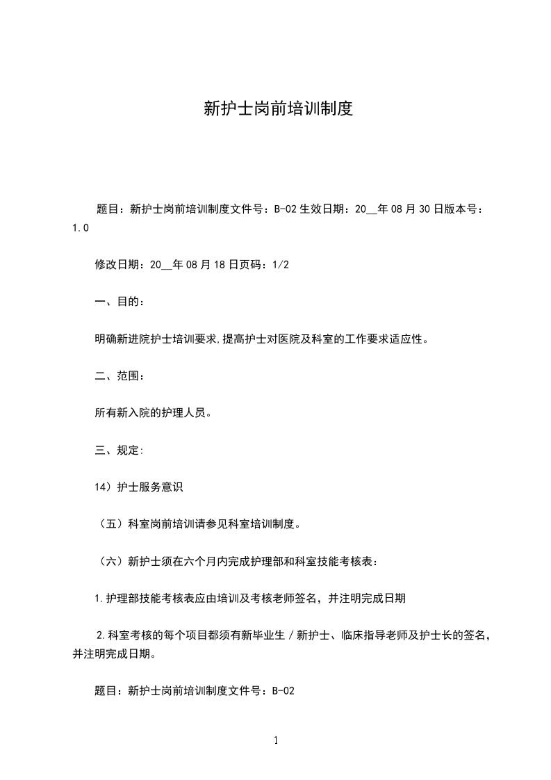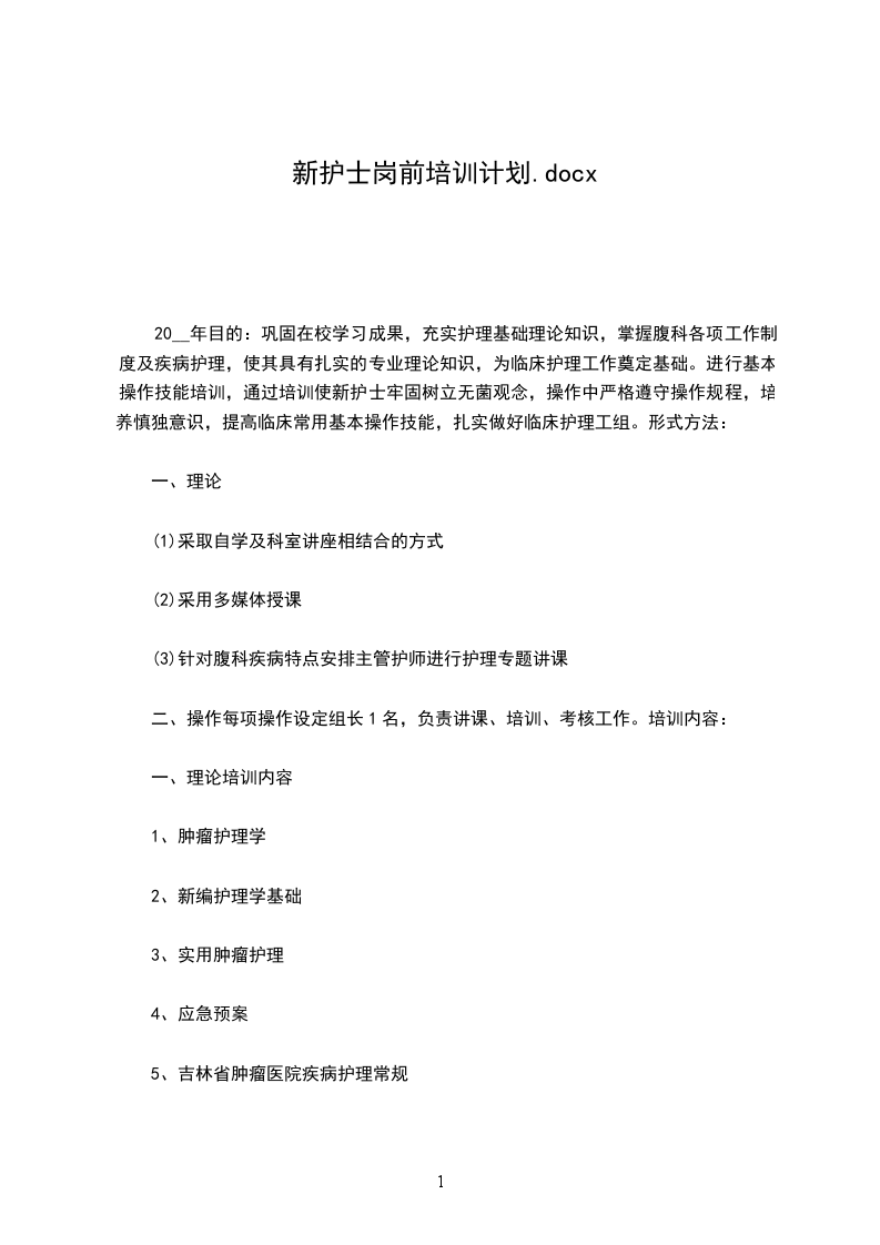 20__年目的:巩固在校学习成果,充实护理基础理论知识,掌握腹科各项工作制度及疾病护理,使其具有扎实的专业理论知识,为临床护理工作奠定基础。进行基本操作技能培训,通过培训使新护士牢固树立无菌观念,操作中严格遵守操作规程,培养慎独意识,提高临床常用基本操作技能,扎实做好临床护理工组。形式方法: