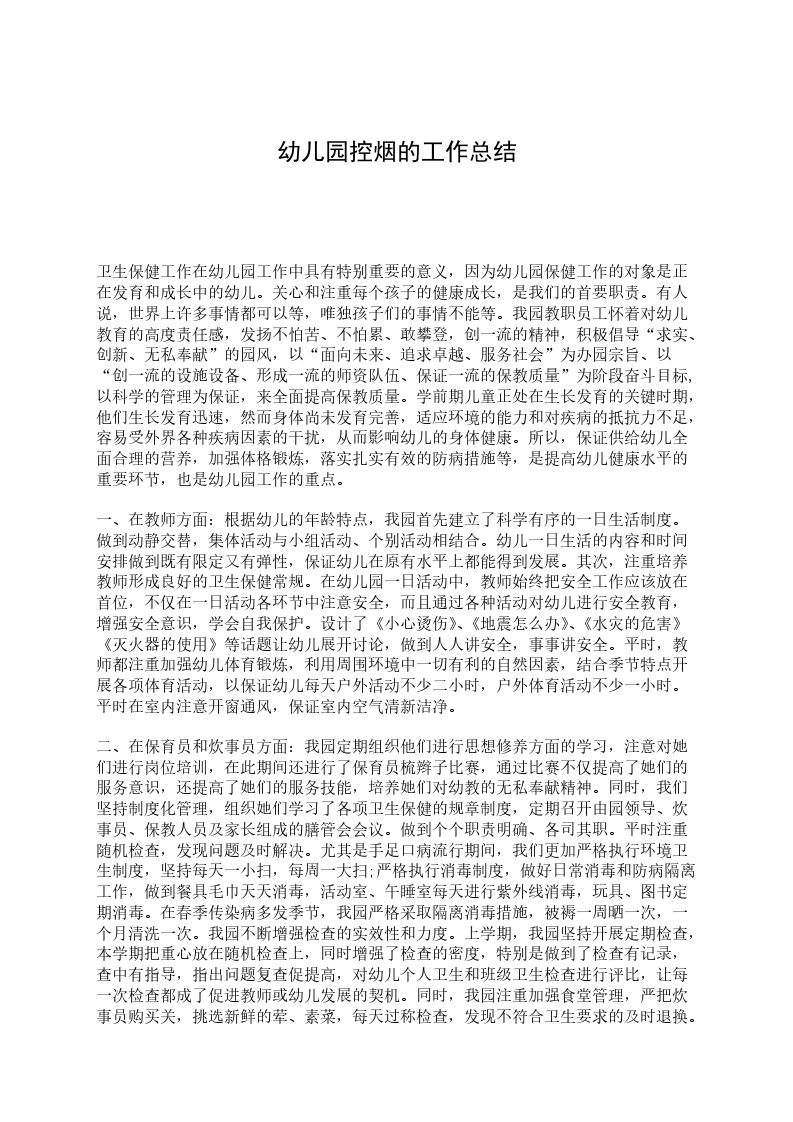 20__年20__年按照年初制定的控烟工作计划,我们通过健康教育、宣传栏、发放宣传单、家长QQ群宣传等多种形式,向全园师生和家长宣传吸烟有害健康等知识,认真学习有关卫生常识和健康促进知识,全园教职工充分认识到吸烟的危害和控烟的意义,严格执行幼儿园控烟规定。做到园内无人吸烟,师幼控烟、控烟意识增强。