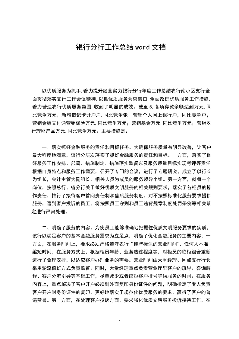 以优质服务为抓手,着力提升经营实力银行分行年度工作总结农行南小区支行全面贯彻落实支行工作会议精神,以抓优质服务为突破口,全面改进优质服务工作措施,着力营造农行优质服务氛围,收到了明显的成效。截至5,各项存款余额达到万元,同比竞争万元;新增借记卡开户户,同比竞争张;营销个人网上银行户,同比竞争户;营销金穗支付通营销保险万元,同比竞争万元;营销基金万元,同比竞争万元;营销农行理财产品万元,同比竞争万元。主要措施是: