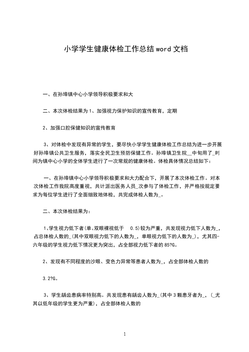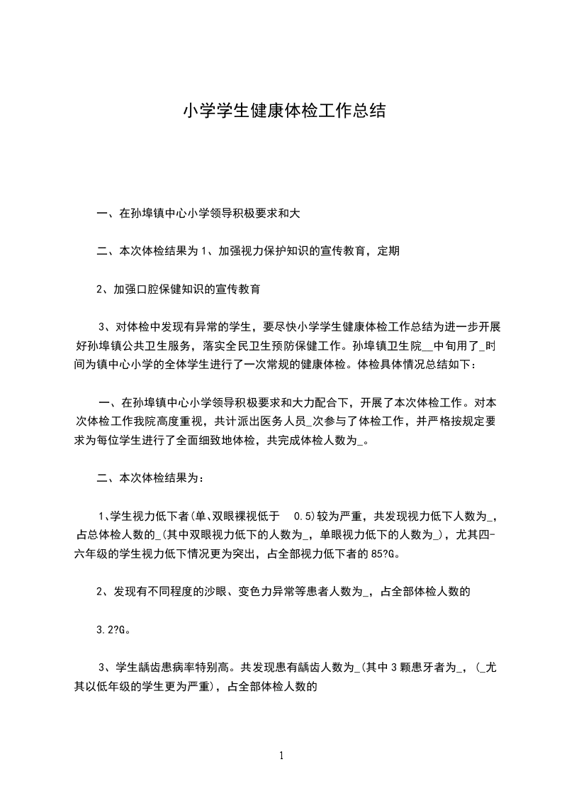 3、对体检中发现有异常的学生,要尽快小学学生健康体检工作总结为进一步开展好孙埠镇公共卫生服务,落实全民卫生预防保健工作。孙埠镇卫生院__中旬用了_时间为镇中心小学的全体学生进行了一次常规的健康体检。体检具体情况总结如下: