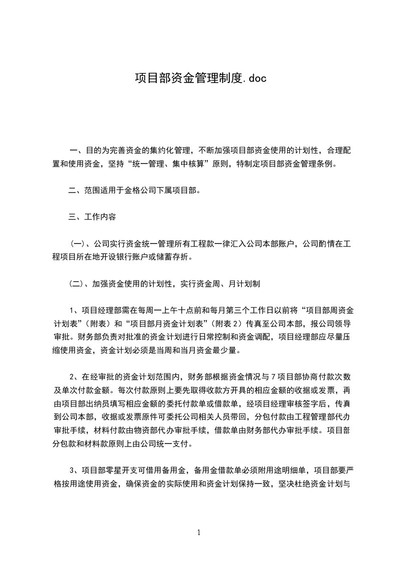 1、项目经理部需在每周一上午十点前和每月第三个工作日以前将“项目部周资金计划表”(附表)和“项目部月资金计划表”(附表2)传真至公司本部,报公司领导审批。财务部负责对批准的资金计划进行日常控制和资金调配,项目经理部应尽量压缩使用资金,资金计划必须是当周和当月资金最少量。