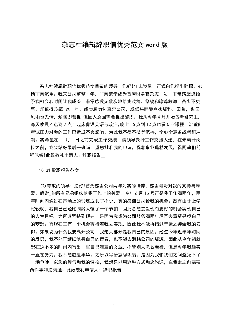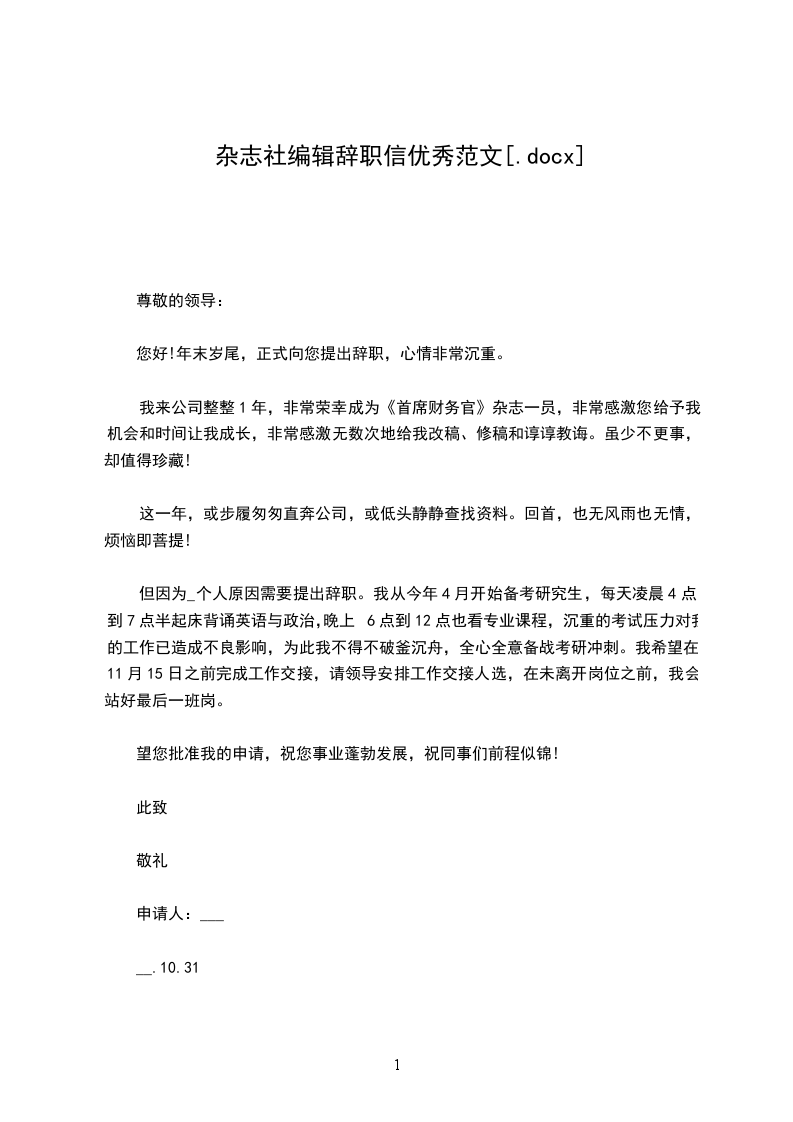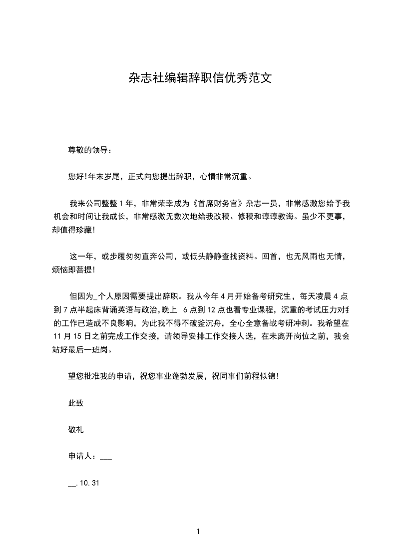 杂志社编辑辞职信优秀范文尊敬的领导:您好!年末岁尾,正式向您提出辞职,心情非常沉重。我来公司整整1年,非常荣幸成为首席财务官杂志一员,非常感激您给予我机会和时间让我成长,非常感激无数次地给我改稿、修稿和谆谆教诲。虽少不更事,却值得珍藏!这一年,或步履匆匆直奔公司,或低头静静查找资料。回首,也无风雨也无情,烦恼即菩提!但因人原因需要提出辞职。我从今年4月开始备考研究生,每天凌晨4点到7点半起床背诵英语与政治,晚上6点到12点也看专业课程,沉重的考试压力对我的工作已造成不良影响,为此我不得不破釜沉舟,全心全意备战考研冲刺。我希望在___月__日之前完成工作交接,请领导安排工作交接人选,在未离开岗位之前,我会站好最后一班岗。望您批准我的申请,祝您事业蓬勃发展,祝同事们前程似锦!此致敬礼申请人:辞职报告__.