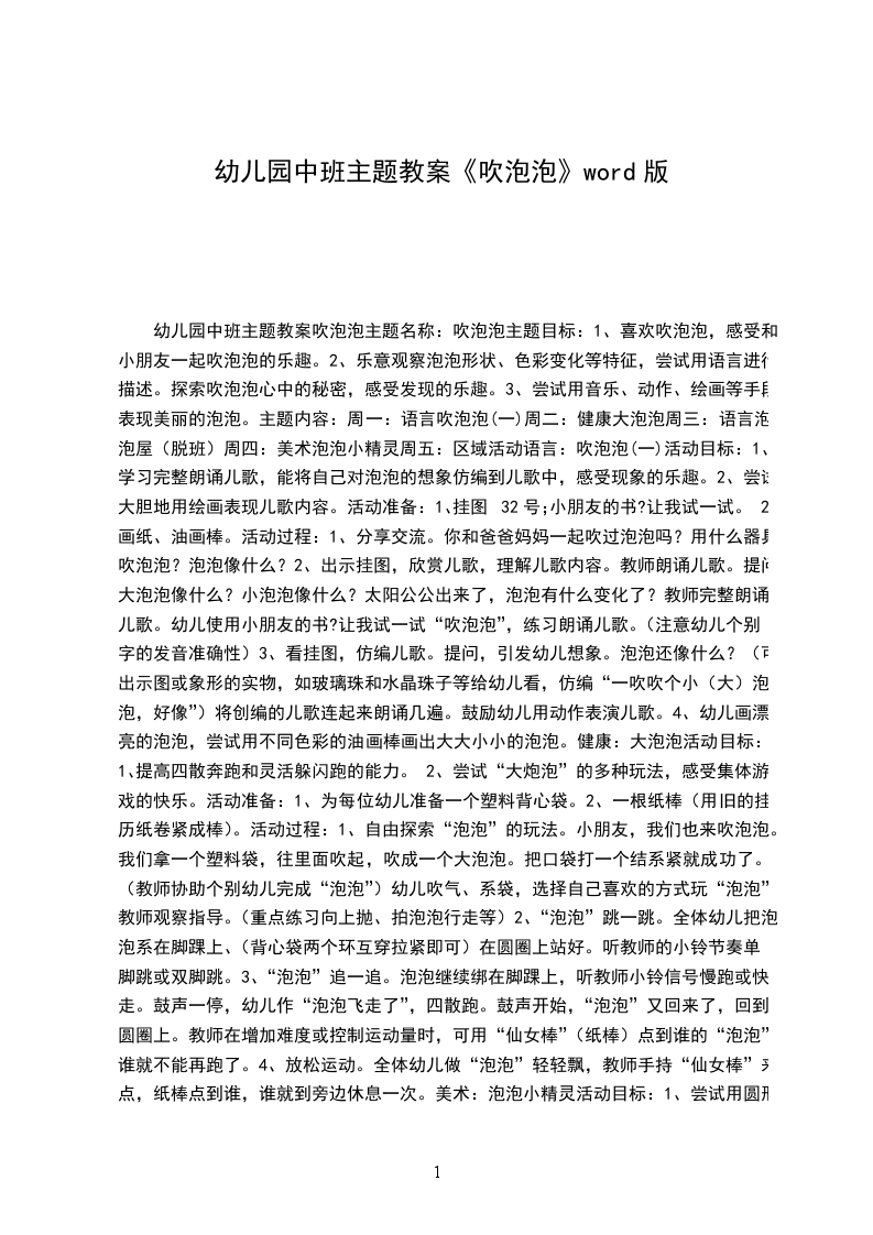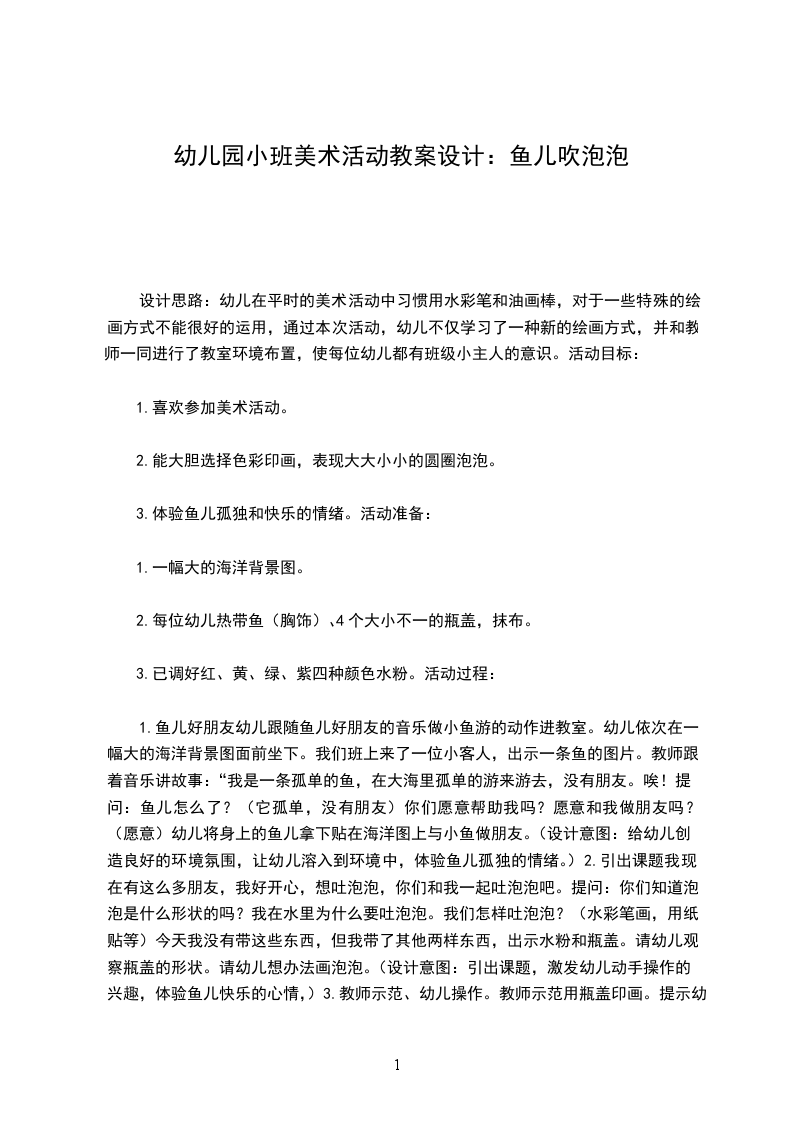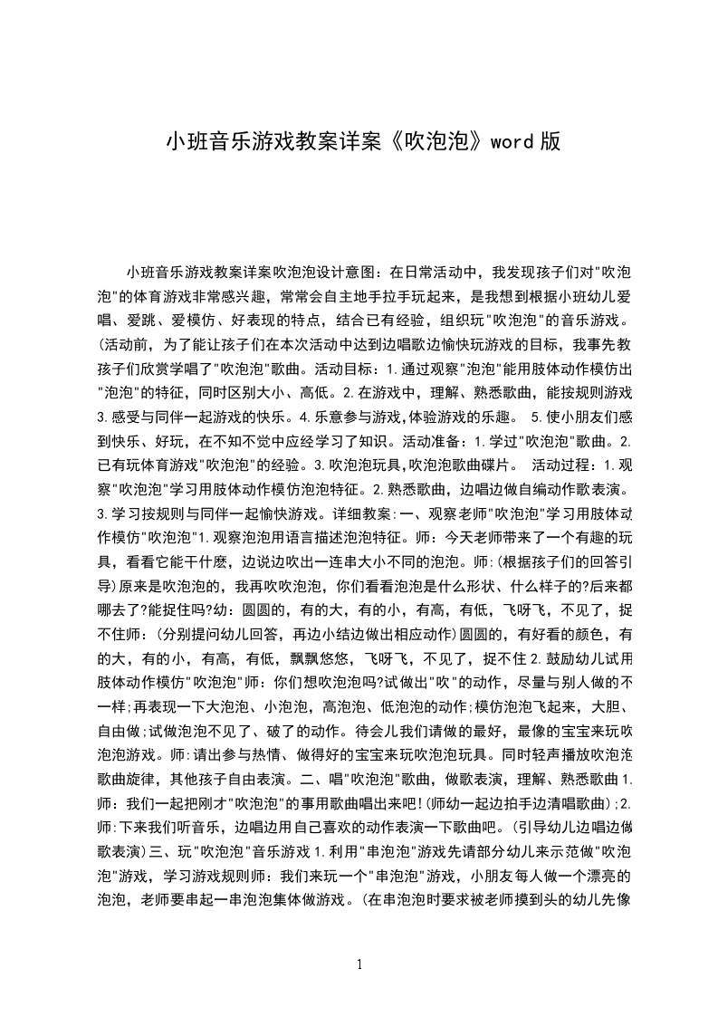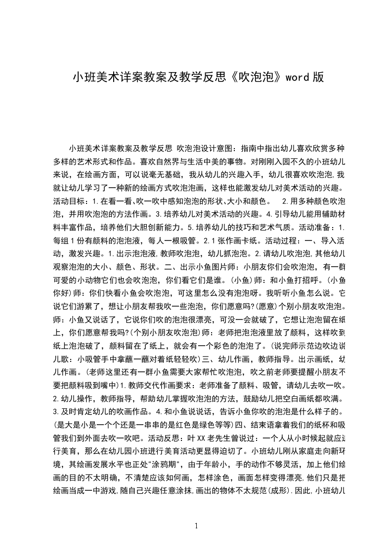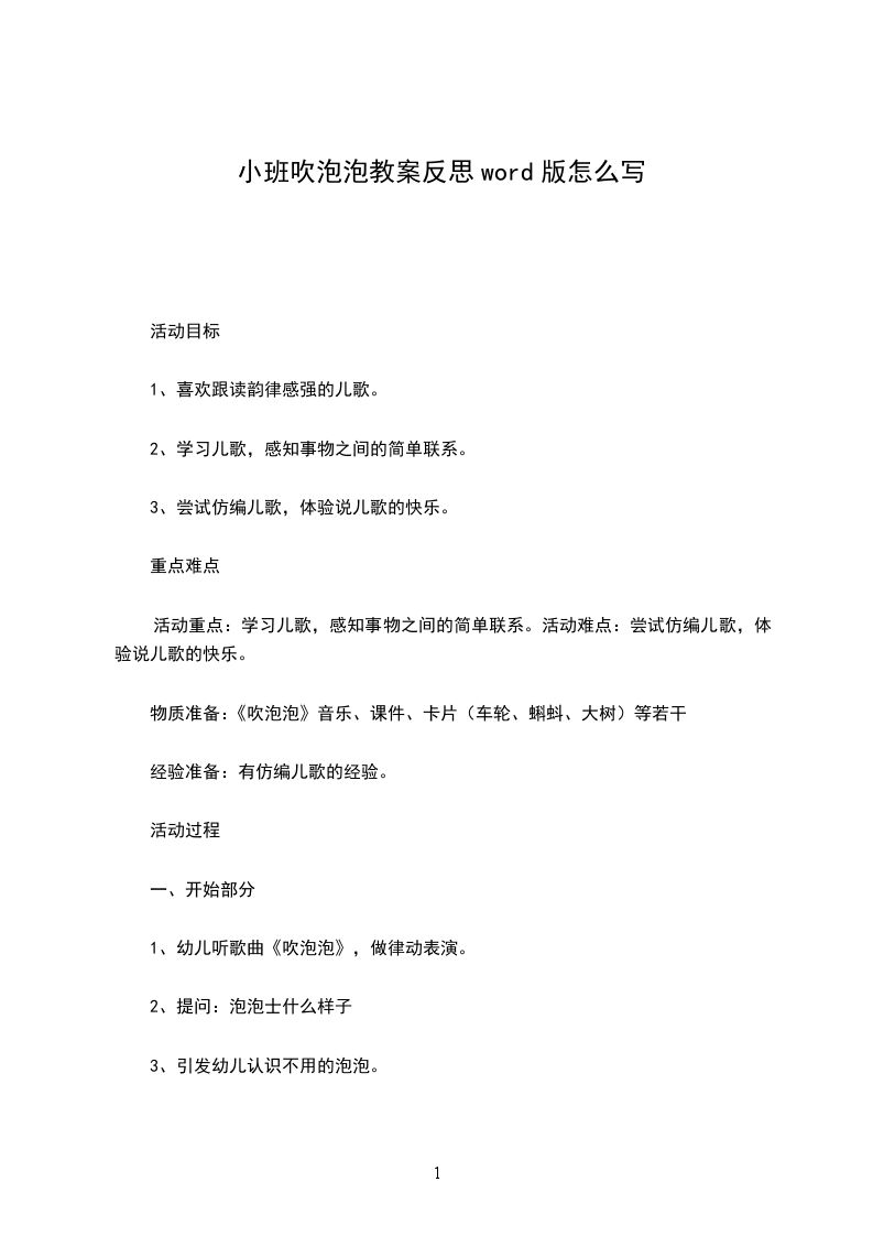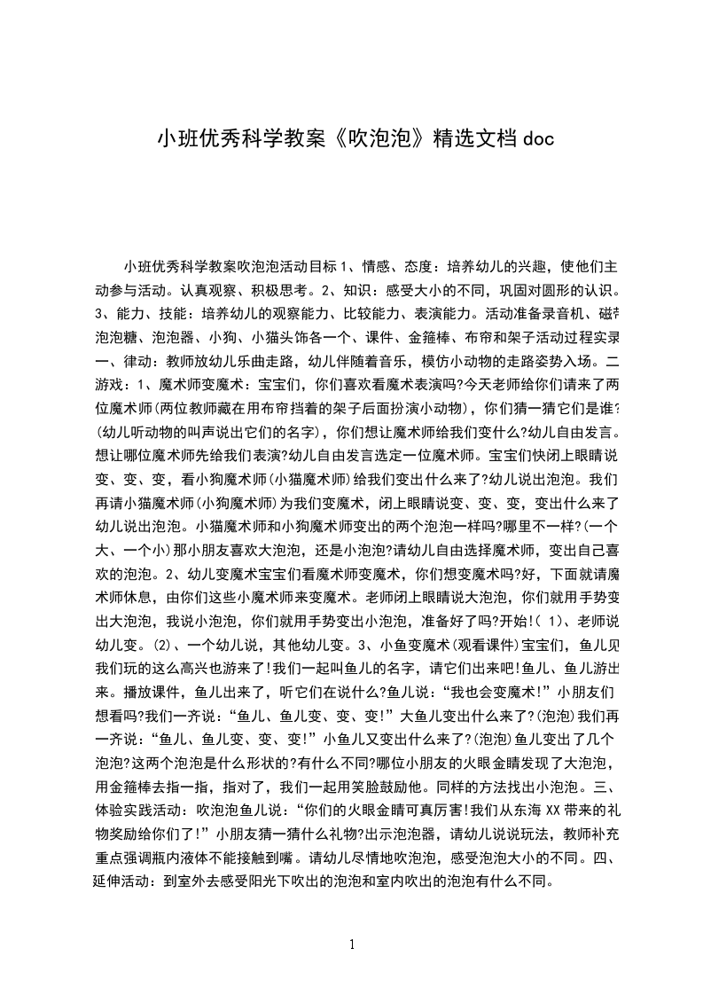(三)结束部分今天我们玩了吹泡泡的游戏,大家开心吗?小班吹泡泡教案2活动来源日常生活中,幼儿在洗手时常常洗很长时间都不出来。通过观察我发现原来孩子们对肥皂泡爱不释手,有时还喜欢用小嘴巴吹吹手上的小泡泡。一天,黄家祺小朋友从家里带来了吹泡泡的玩具,为大家吹出了一串串的泡泡。这下孩子们更是乐开了花,他们还兴奋地喊:“泡泡多像大太阳啊圆圆的,像你的眼睛,像大气球”我结合孩子们对泡泡的兴趣和对泡泡的想象创编了生动有趣的儿歌,生成了这次欣赏活动。准备