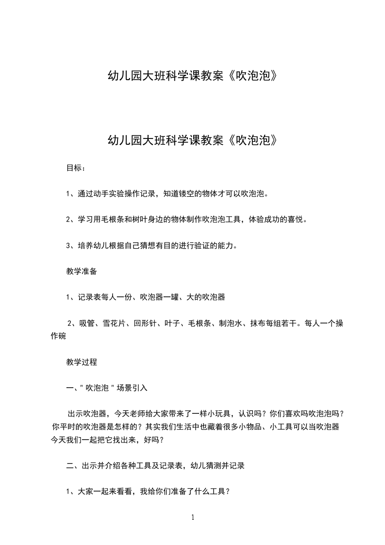 一、设计意图:“吹泡泡”是幼儿童年中最好玩、最难忘的游戏,幼儿都很喜欢它的乐趣和体验。“吹泡泡”也来源于幼儿的生活,所以我通过吹泡泡的形式让孩子们观察了解泡泡的五彩缤纷,利用泡泡引发了孩子们更多的遐想,给予幼儿更多去想去说的空间。因此设计科学活动吹泡泡,主要培养幼儿探究问题,发现问题,解决问题的良好品质,为幼儿的一生奠定良好的基础。