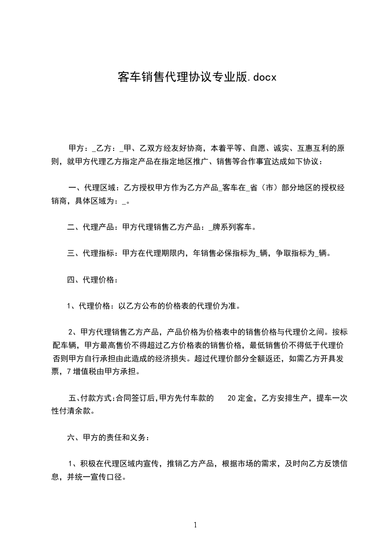 一、代理区域:乙方授权甲方作为乙方产品_客车在_省(市)部分地区的授权经销商,具体区域为:_。