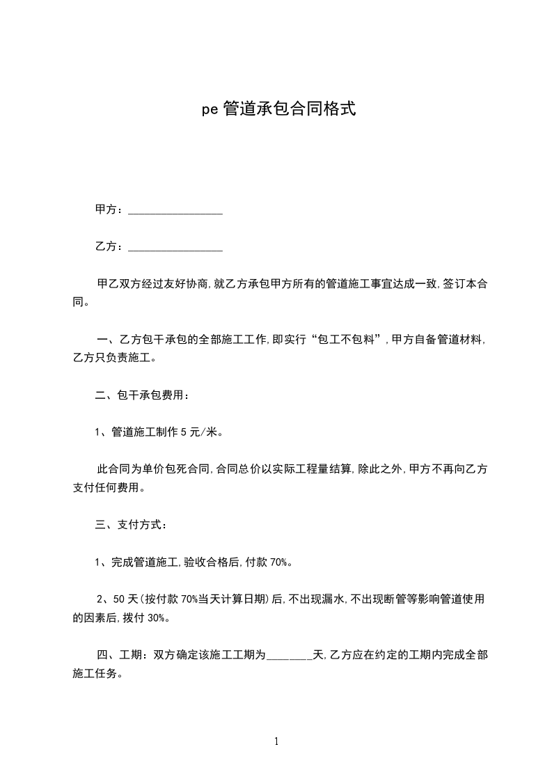 甲乙双方经过友好协商,就乙方承包甲方所有的管道施工事宜达成一致,签订本合同。