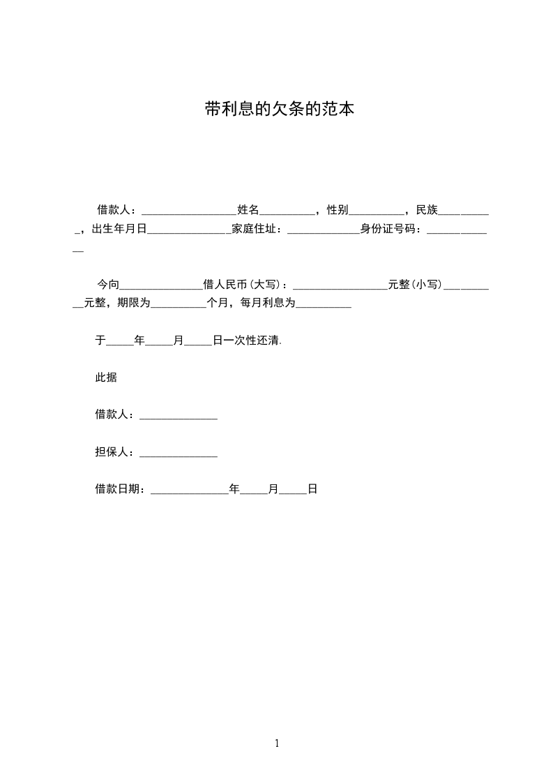 今向_______________借人民币(大写):_________________元整(小写)__________元整,期限为__________个月,每月利息为__________