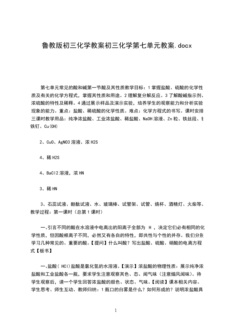 第七单元常见的酸和碱第一节酸及其性质教学目标:1掌握盐酸、硫酸的化学性质及有关的化学方程式,掌握其性质和用途。2理解复分解反应。3了解酸碱指示剂、浓硫酸的特性及稀释。4通过展示样品及演示实验,培养学生的观察能力和分析实验现象的能力。重点:盐酸、稀硫酸的化学性质。难点:化学方程式的书写。课时安排:三课时教学用品:纯净浓盐酸、工业浓盐酸、稀盐酸、NaOH溶液、Zn粒、铁丝段、锈铁钉、Cu(OH)
