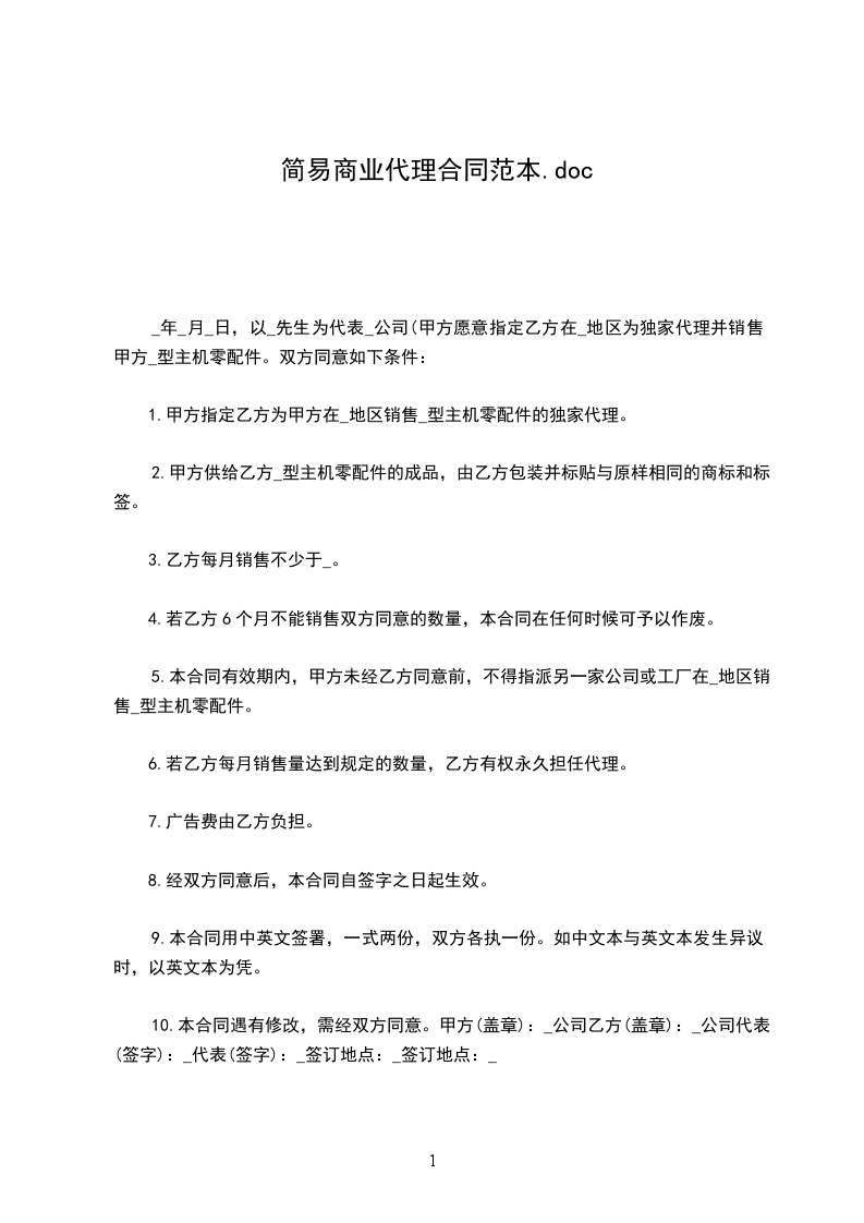 _年_月_日,以_先生为代表_公司(甲方愿意指定乙方在_地区为独家代理并销售甲方_型主机零配件。双方同意如下条件: