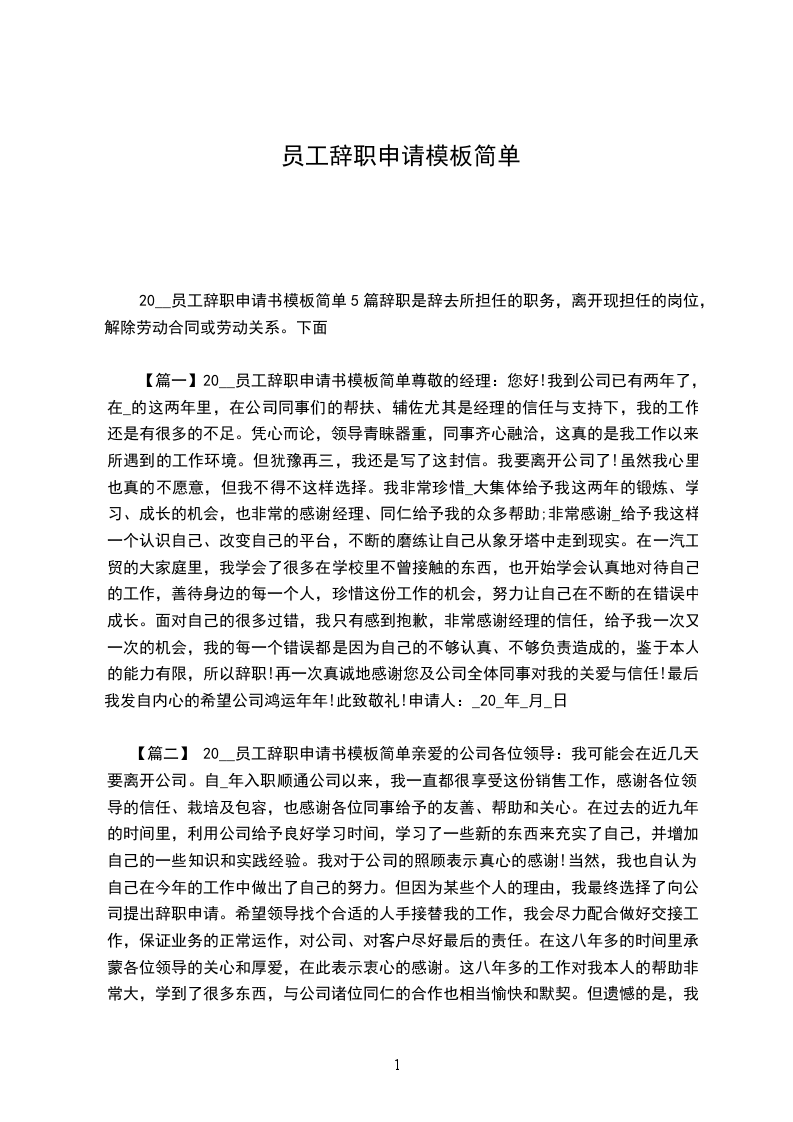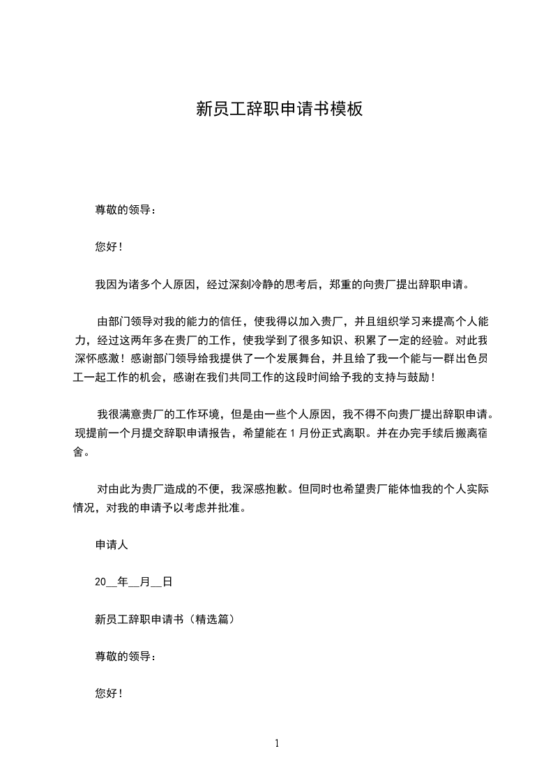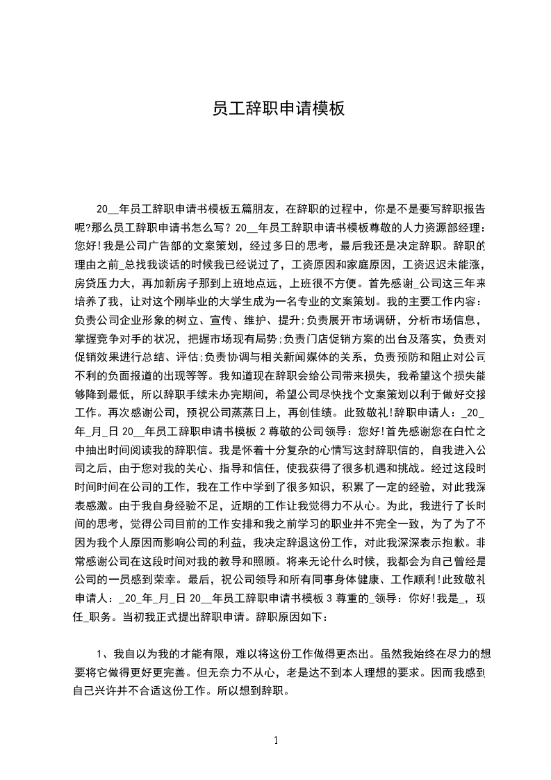 20__年员工辞职申请书模板五篇朋友,在辞职的过程中,你是不是要写辞职报告呢?那么员工辞职申请书怎么写?20__年员工辞职申请书模板尊敬的人力资源部经理:您好!我是公司广告部的文案策划,经过多日的思考,最后我还是决定辞职。辞职的理由之前_总找我谈话的时候我已经说过了,工资原因和家庭原因,工资迟迟未能涨,房贷压力大,再加新房子那到上班地点远,上班很不方便。首先感谢_公司这三年来培养了我,让对这个刚毕业的大学生成为一名专业的文案策划。我的主要工作内容:负责公司企业形象的树立、宣传、维护、提升;负责展开市场调研,分析市场信息,掌握竞争对手的状况,把握市场现有局势;负责门店促销方案的出台及落实,负责对促销效果进行总结、评估;负责协调与相关新闻媒体的关系,负责预防和阻止对公司不利的负面报道的出现等等。我知道现在辞职会给公司带来损失,我希望这个损失能够降到最低,所以辞职手续未办完期间,希望公司尽快找个文案策划以利于做好交接工作。再次感谢公司,预祝公司蒸蒸日上,再创佳绩。此致敬礼!辞职申请人:_20_年_月_日20__年员工辞职申请书模板2尊敬的公司领导:您好!首先感谢您在白忙之中抽出时间阅读我的辞职信。我是怀着十分复杂的心情写这封辞职信的,自我进入公司之后,由于您对我的关心、指导和信任,使我获得了很多机遇和挑战。经过这段时时间时间在公司的工作,我在工作中学到了很多知识,积累了一定的经验,对此我深表感激。由于我自身经验不足,近期的工作让我觉得力不从心。为此,我进行了长时间的思考,觉得公司目前的工作安排和我之前学习的职业并不完全一致,为了为了不因为我个人原因而影响公司的利益,我决定辞退这份工作,对此我深深表示抱歉。非常感谢公司在这段时间对我的教导和照顾。将来无论什么时候,我都会为自己曾经是公司的一员感到荣幸。最后,祝公司领导和所有同事身体健康、工作顺利!此致敬礼申请人:_20_年_月_日20__年员工辞职申请书模板3尊重的_领导:你好!我是_,现任_职务。当初我正式提出辞职申请。辞职原因如下: