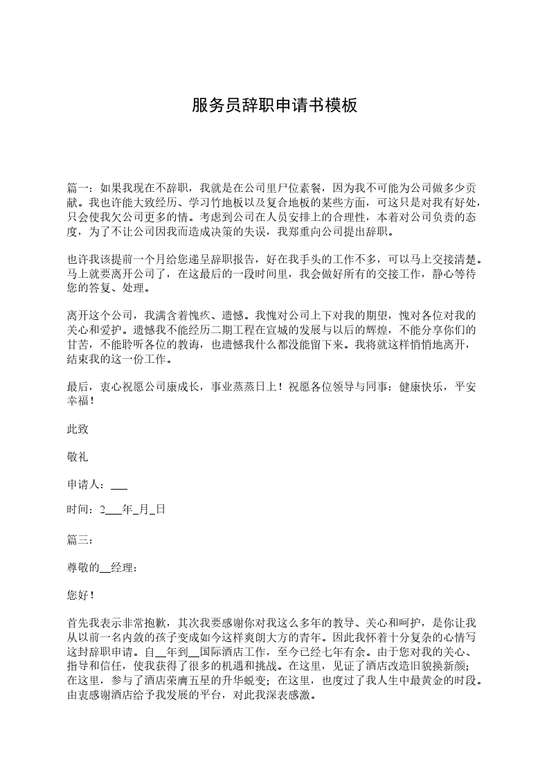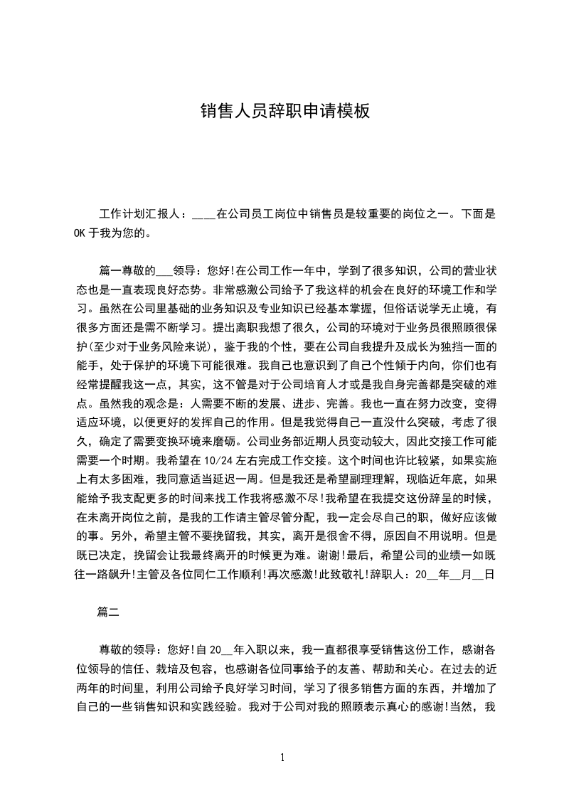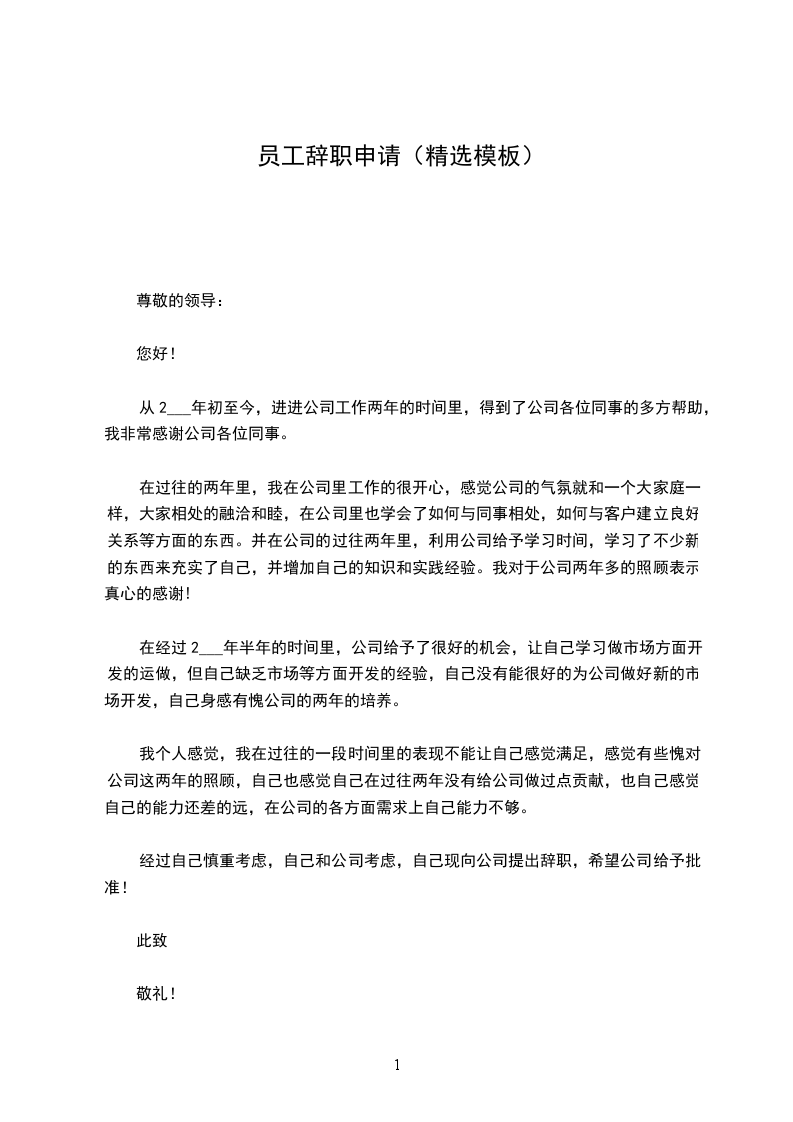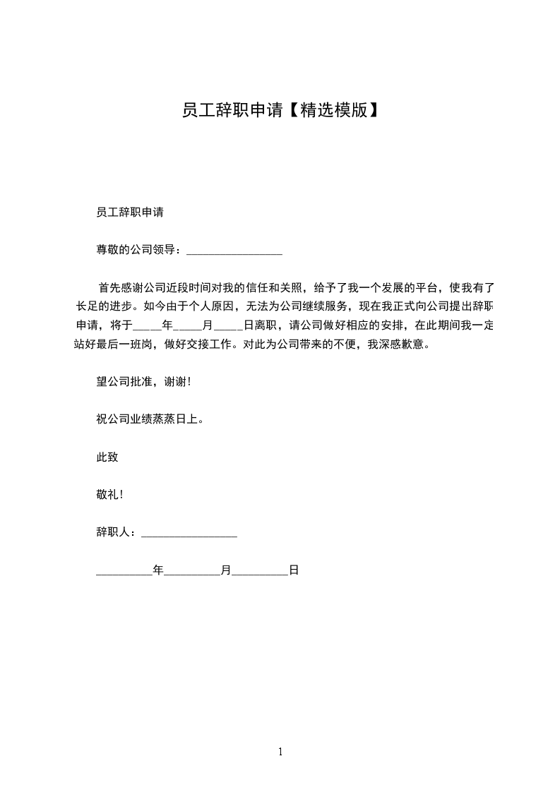 20__年员工辞职申请书模板五篇朋友,在辞职的过程中,你是不是要写辞职报告呢?那么员工辞职申请书怎么写?20__年员工辞职申请书模板尊敬的人力资源部经理:您好!我是公司广告部的文案策划,经过多日的思考,最后我还是决定辞职。辞职的理由之前_总找我谈话的时候我已经说过了,工资原因和家庭原因,工资迟迟未能涨,房贷压力大,再加新房子那到上班地点远,上班很不方便。首先感谢_公司这三年来培养了我,让对这个刚毕业的大学生成为一名专业的文案策划。我的主要工作内容:负责公司企业形象的树立、宣传、维护、提升;负责展开市场调研,分析市场信息,掌握竞争对手的状况,把握市场现有局势;负责门店促销方案的出台及落实,负责对促销效果进行总结、评估;负责协调与相关新闻媒体的关系,负责预防和阻止对公司不利的负面报道的出现等等。我知道现在辞职会给公司带来损失,我希望这个损失能够降到最低,所以辞职手续未办完期间,希望公司尽快找个文案策划以利于做好交接工作。再次感谢公司,预祝公司蒸蒸日上,再创佳绩。此致敬礼!辞职申请人:_20_年_月_日20__年员工辞职申请书模板2尊敬的公司领导:您好!首先感谢您在白忙之中抽出时间阅读我的辞职信。我是怀着十分复杂的心情写这封辞职信的,自我进入公司之后,由于您对我的关心、指导和信任,使我获得了很多机遇和挑战。经过这段时时间时间在公司的工作,我在工作中学到了很多知识,积累了一定的经验,对此我深表感激。由于我自身经验不足,近期的工作让我觉得力不从心。为此,我进行了长时间的思考,觉得公司目前的工作安排和我之前学习的职业并不完全一致,为了为了不因为我个人原因而影响公司的利益,我决定辞退这份工作,对此我深深表示抱歉。非常感谢公司在这段时间对我的教导和照顾。将来无论什么时候,我都会为自己曾经是公司的一员感到荣幸。最后,祝公司领导和所有同事身体健康、工作顺利!此致敬礼申请人:_20_年_月_日20__年员工辞职申请书模板3尊重的_领导:你好!我是_,现任_职务。当初我正式提出辞职申请。辞职原因如下:
