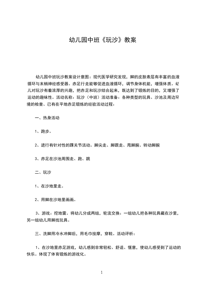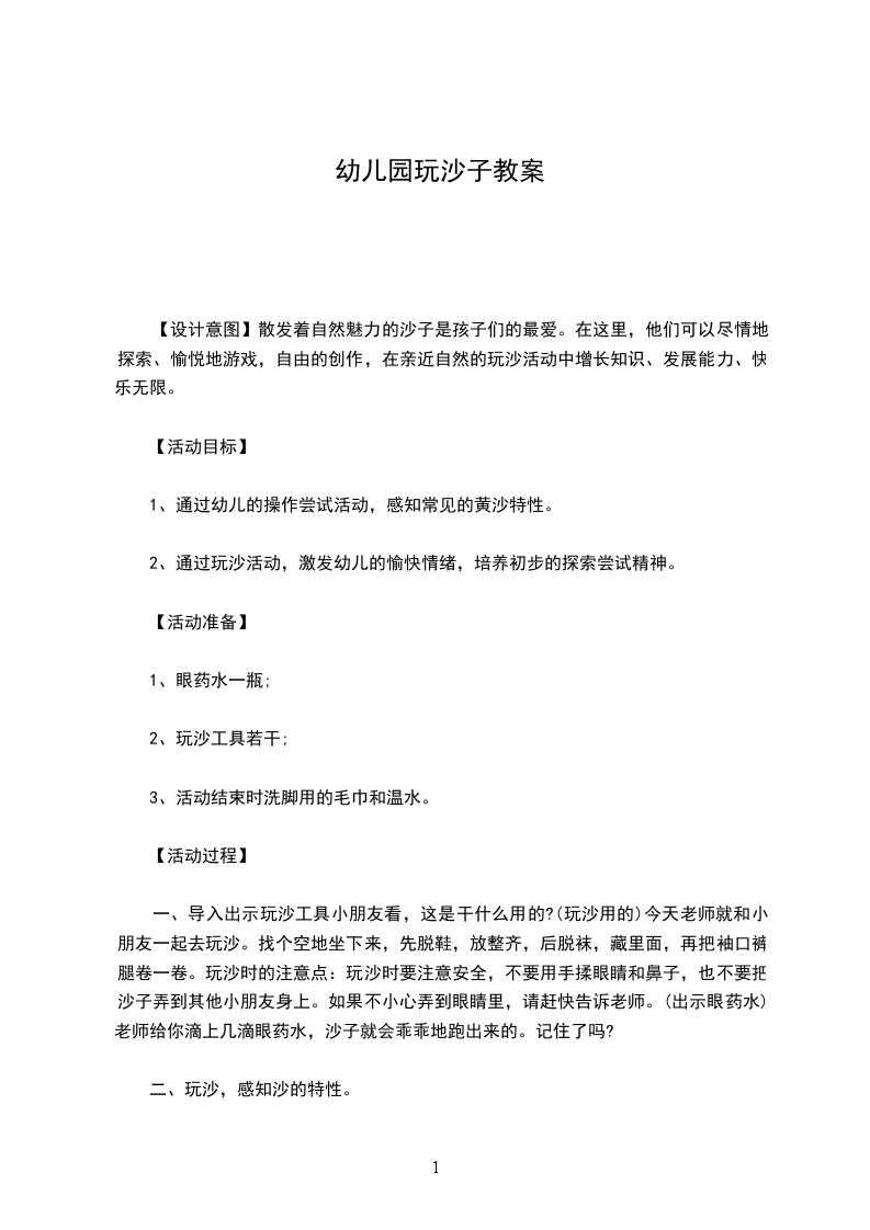 5、能大胆、清楚地表达自己对沙子的见解,体验成功的快乐。教学重点、难点活动重点:感知沙子的特性。体验玩沙的快乐,活动难点:对沙子特性的感知活动准备戏沙池、玩沙工具、搅拌棒、水、塑料筛、小盆沙(用报纸遮住)。活动过程