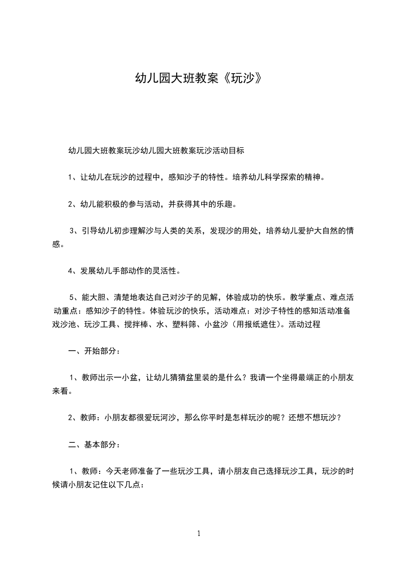 四、延伸活动:幼儿用沙自制玩具沙包、沙锤等,进一步扩大幼儿对沙的认识。教学反思这节活动课,效果还不错,不仅调动了每个幼儿的积极性,而且师幼配合的非常好,在游戏活动中让幼儿通过尝试操作活动,进一步感知沙的特性。通过这次活动,使幼儿在情感、态度、能力、知识方面得到了全面、自主的发展。达到了预期目标。如果重新上这节课,我会注意幼儿语言表达能力的培养,以纠正幼儿在回答问题时夹杂一些方言习惯。幼儿园大班教案玩沙2教学目标: