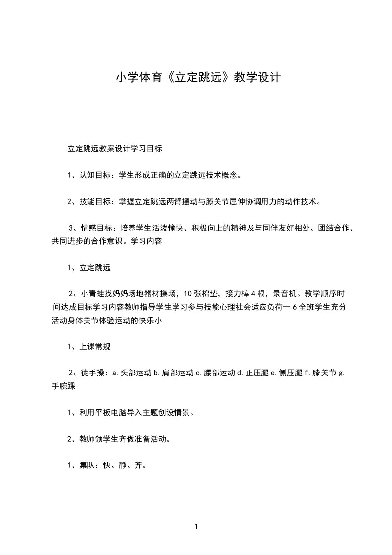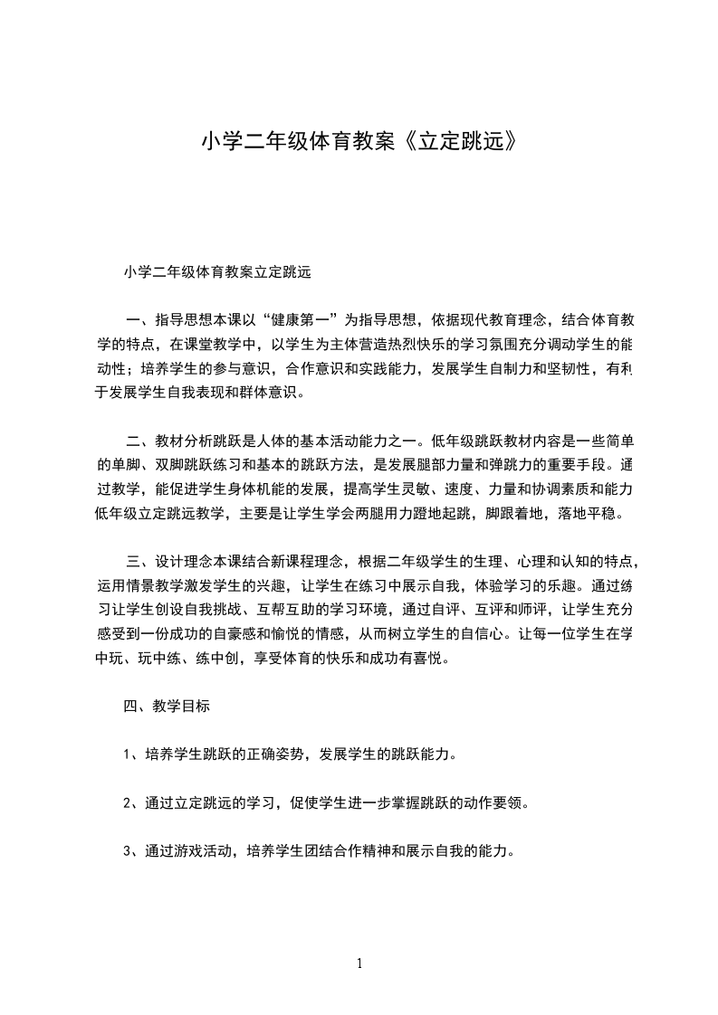 小青蛙学舞蹈立定跳远教学计划:在实施新课程标准发展素质教育的今天,体育课堂教学不再是传统单调、枯燥的学习氛围,而是要通过教学让学生充分展示、体现自我。特别是对小学低年级学生来说,通过游戏形式进行体育教学,达到教学目的,提高学习成绩,激发学习兴趣,已逐步成为体育教师一种行之有效的教学手段。本课就以新课程标准为指导,依据低年级学生的年龄特点,运用主题式的教学模式,结合本课教材内容,创设情境,给学生创造一个生动、活泼的学习氛围,使学生的活动处玩中学、学中玩,每位学生都能体验到成功的喜悦,充分享受到活动的快乐,从而激发了学生的学习兴趣。教学设计:现代教育的目标是培养一个身心健康,能独立面对社会挑战,具有主体意识及积极向上的处世态度和具有探索创新精神,能接纳他人的身心健康的人。坚持“以学生发展为本”,突出学生主体地位,充分发挥学生的主体作用,是优化教学过程,提高教学效率的关键。培养学生对体育活动的兴趣,提高学生参与体育活动的积极性是小学阶段体育课的重要目标之一,为达到这个目标,将其归纳为:“乐中练,动中练,玩中练。”这里的“练”是发展能力的手段,而“乐、动、玩”则是培养学生的关键。学校体育是终身体育的基础,运动兴趣和习惯是促进学生自主学习和终身坚持锻炼的前提。结合新课程标准理念,根据低年级儿童的生理、心理和认知特点,本课教学设计以激发学生学习兴趣入手,创设了“小青蛙学跳舞”的教学情境,借助小朋友喜欢动物形象导入课题,教师通过语言的描绘、儿歌的渲染、游戏的创编、场景的布置,让每一位学生在学中玩、玩中练、练中创、充分享受体育的快乐和成功的喜悦。教学过程:课题小青蛙学跳舞:立定跳远教学目标