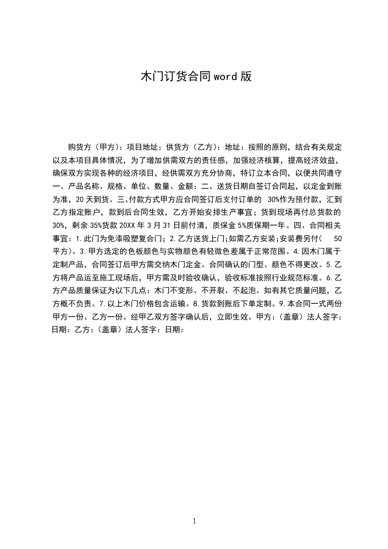 1、合同签订后2天内需方支付预付款本合同总造价的30%,货到工地需方支付至货款造价80%,款到安装,安装费待门全部安装完成后付清安装费,