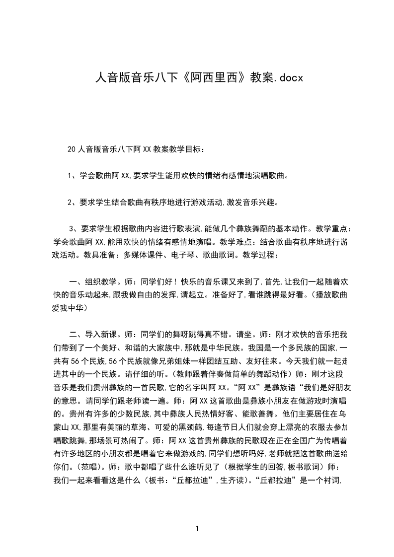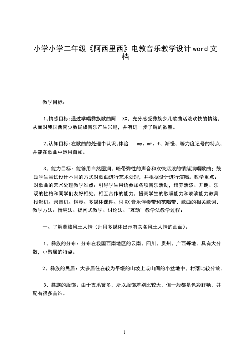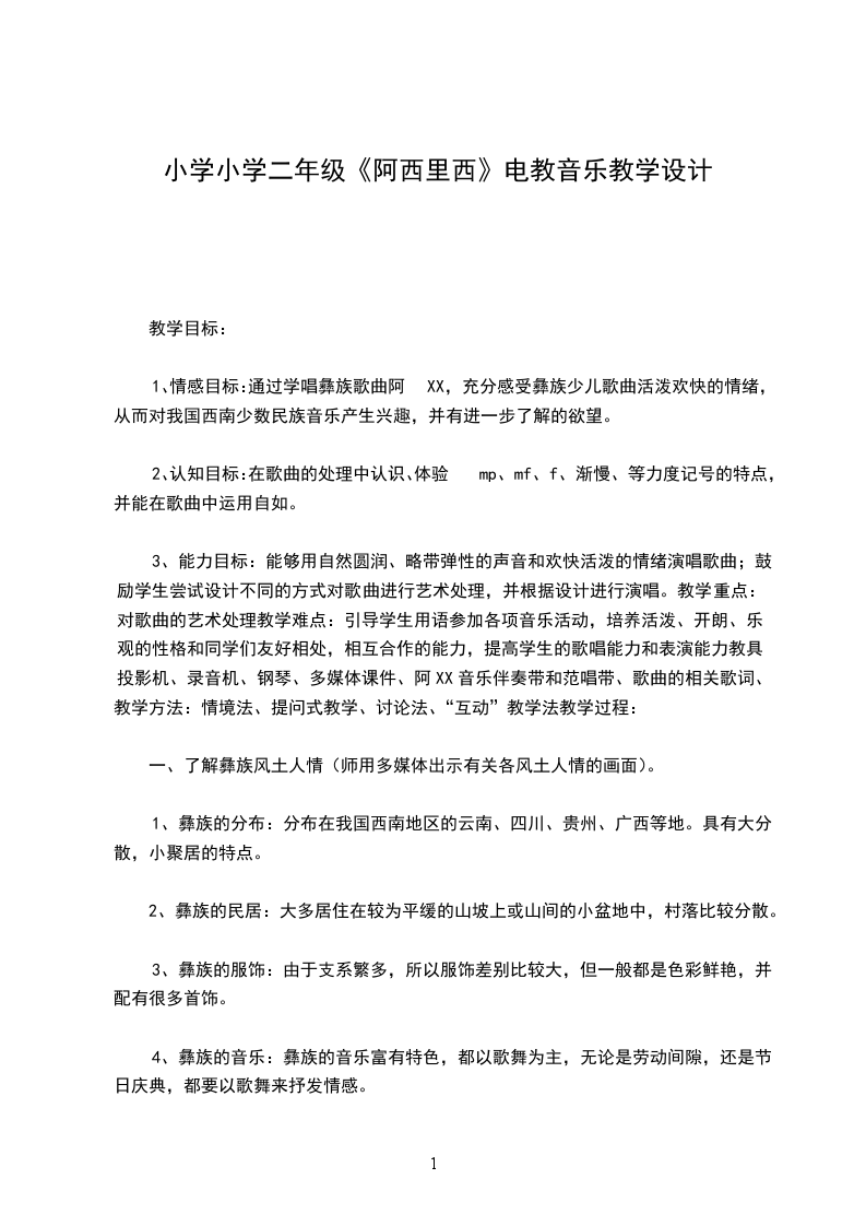 1、情感目标:通过学唱彝族歌曲阿XX,充分感受彝族少儿歌曲活泼欢快的情绪,从而对我国西南少数民族音乐产生兴趣,并有进一步了解的欲望。