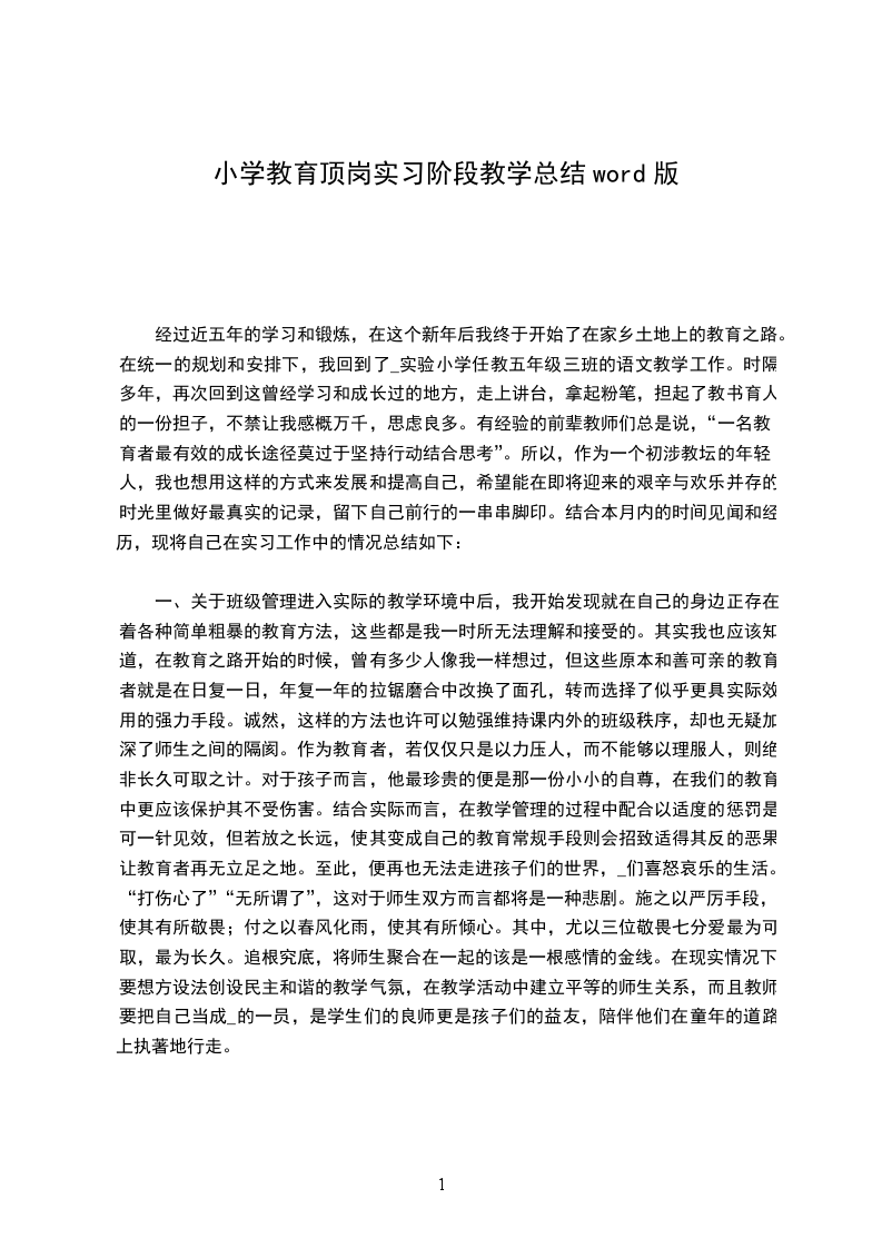 经过近五年的学习和锻炼,在这个新年后我终于开始了在家乡土地上的教育之路。在统一的规划和安排下,我回到了_实验小学任教五年级三班的语文教学工作。时隔多年,再次回到这曾经学习和成长过的地方,走上讲台,拿起粉笔,担起了教书育人的一份担子,不禁让我感概万千,思虑良多。有经验的前辈教师们总是说,“一名教育者最有效的成长途径莫过于坚持行动结合思考”。所以,作为一个初涉教坛的年轻人,我也想用这样的方式来发展和提高自己,希望能在即将迎来的艰辛与欢乐并存的时光里做好最真实的记录,留下自己前行的一串串脚印。结合本月内的时间见闻和经历,现将自己在实习工作中的情况总结如下: