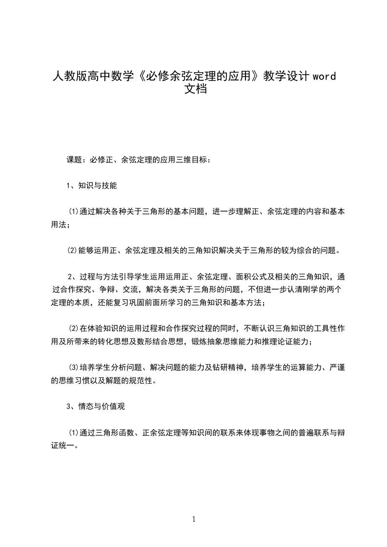 2、过程与方法引导学生运用运用正、余弦定理、面积公式及相关的三角知识,通过合作探究、争辩、交流,解决各类关于三角形的问题,不但进一步认清刚学的两个定理的本质,还能复习巩固前面所学习的三角知识和基本方法;