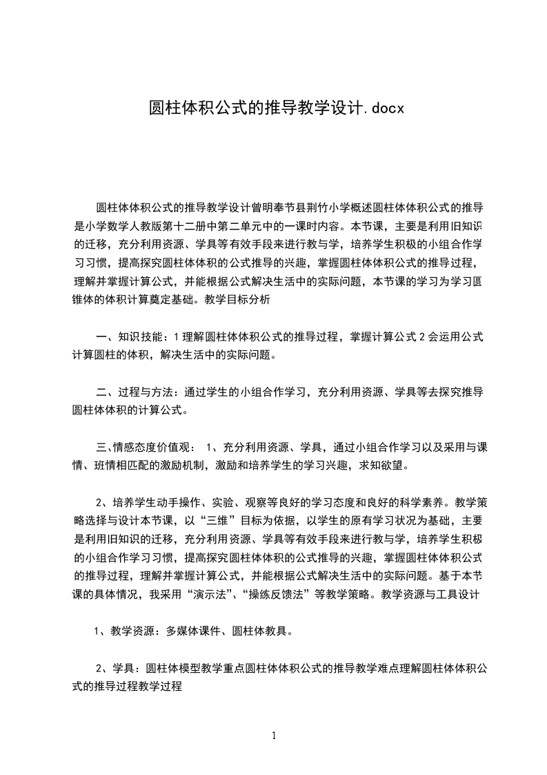 圆柱的体积教材分析教材安排了两个例题,例5教学圆柱体积公式的推导,例6是利用圆柱的体积的计算解决问题。在教学圆柱体记公式的推导过程中,教材渗透了转化的思想,首先从回顾救治(长方体,正方体的体积计算)入手,引出援助提及的计算问题,并提出圆柱能否转化成以学过的立体图形来计算体积。接着通过教具演示说明把圆柱的底面积分成若干个相等的扇形,把圆柱切开拼成一个近似的长方体,然后引导学生观察和推理,得出这个长方体的底面积等于圆柱的底面积s,高就是圆柱的高h。有厂房体的体积计算公式得出圆柱的体积计算公式v=sh。学情分析根据六年级的教学情况来看,班中绝大部分同学都能跟上现有的进度,通过本节课教学要使灵活运用圆柱体积的计算方法解决生活中一些简单的问题,通过想象、操作等活动,理解圆柱体体积公式的推导过程,掌握计算公式;会运用公式计算圆柱的体积教学策略:这部分内容是在学生已经学会计算长方体、正方体的体积,并且掌握圆柱基本特征的基础上,引导学生探索并掌握圆柱的体积公式。例5安排第一步教学要达到三个目的,一是认识等底等高的含义,便于判断圆柱可以转化成与它等底等高的长方体。二是从长方体与正方体等底等高,体积也相等的事实,引发等底等高的圆柱与长方体的体积也相等的猜想,形成把圆柱转化成长方体的活动心向。三是复习长方体、正方体的体积公式,圆柱的体积最终也要这样计算。练习五的第1题巩固圆柱的体积公式,第2-4题解决实际问题的过程中进一步理解和掌握圆柱的体积公式,感受数学知识的应用价值。第5题把所学知识应用到实际生活,第6-13题,提高应用公式的能力,体会底面积、侧面积、表面积和容积概念及计算中的联系和区别,思考题进一步培养学生的空间想象能力和综合应用数学知识解决实际问题的能力。教学目标:
