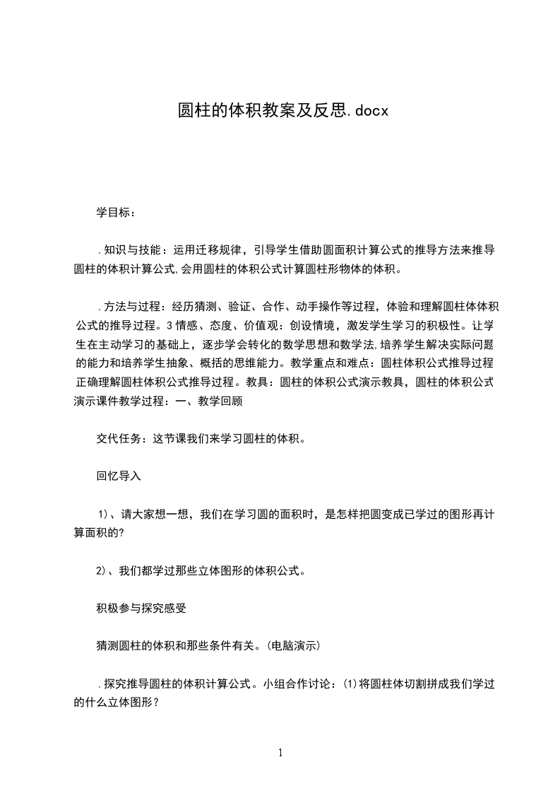 3.通过圆柱体积计算公式的推导、运用的过程,体验数学问题的探索性和挑战性,感受数学思考过程的条理性和数学结论的确定性,获得成功的喜悦。教学重点:让学生探索并掌握圆柱体积的计算方法,并能运用计算公式解决简单的实际问题。教学难点:让学生经历观察、实验、猜想、证明等数学活动过程掌握圆柱体积的计算方法。教学方法:操作法、推理法、讲授法教学过程:一、复习引新。我们以前学过哪些立体图形?生答:长方体和正方体。它们的体积是怎么求的?长方体:长宽高,正方体:棱长棱长棱长。