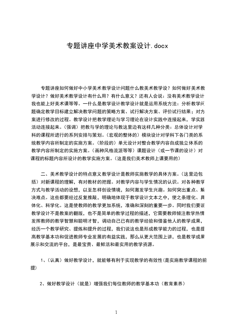 专题讲座如何做好中小学美术教学设计问题什么教美术教学设?如何做好美术教学设计?做好美术教学设计有什么用?有什么意义?还有人会说:没有美术教学设计,我也能上好美术课等等。一什么是教学设计教学设计就是运用系统方法:分析教学问题确定教学目标建立解决教学问题的策略方案、试行解决方案、评价试行结果;对方案进行修改的过程。教学设计把教学理论与学习理论在设计实践中连接起来,学实践活动连接起来。(强调)把教与学的理论与教这里边有这样几种分类:总体设计对学科的课程所进行的系列安排与策划。(宏观的整体的)模块设计对学科下各门类的系统教学内容所制定的实施方案。(阶段的)单元设计对整合教学内容自成独立体系的教学内容所制定的实施方案。(画种风格流派等等)课题设计(或一节课的设计)对课程的标题内容所设计的教学实施方案。(这是我们美术教师上课要用的)