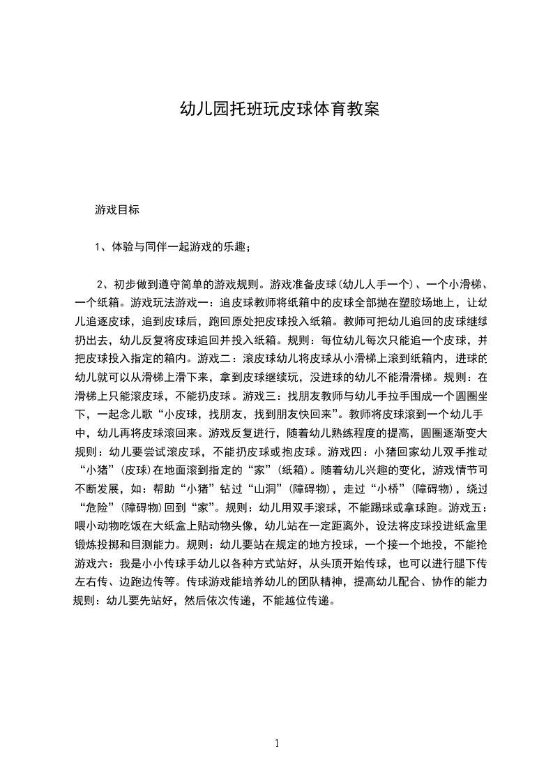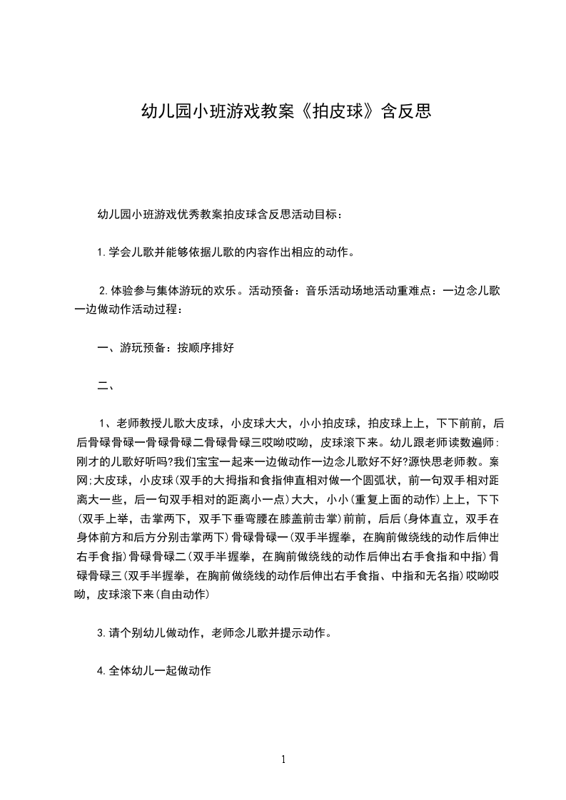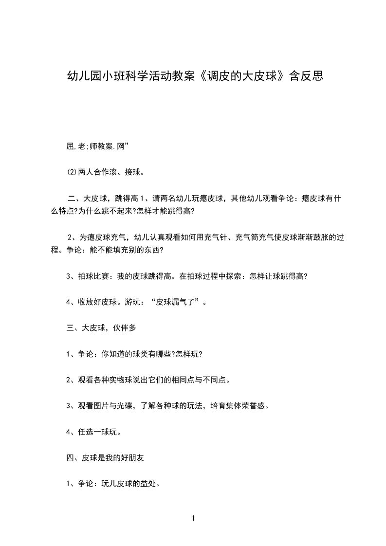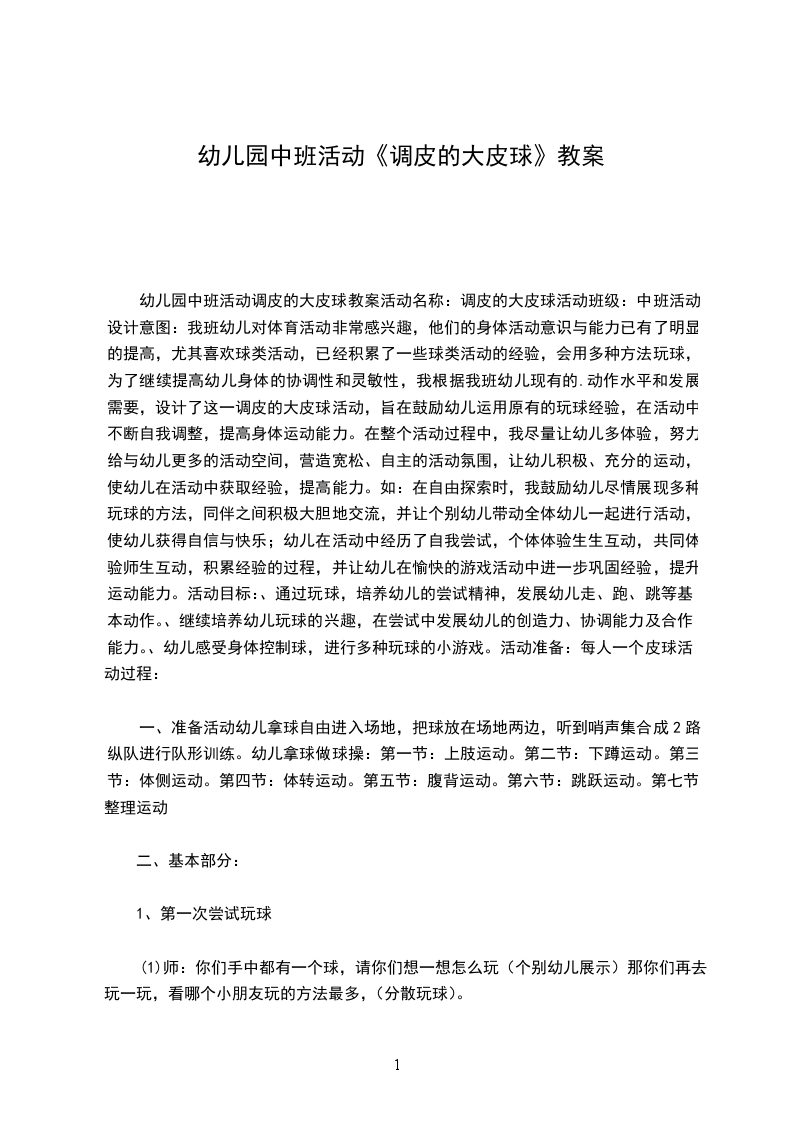 幼儿园中班活动调皮的大皮球教案活动名称:调皮的大皮球活动班级:中班活动设计意图:我班幼儿对体育活动非常感兴趣,他们的身体活动意识与能力已有了明显的提高,尤其喜欢球类活动,已经积累了一些球类活动的经验,会用多种方法玩球,为了继续提高幼儿身体的协调性和灵敏性,我根据我班幼儿现有的.动作水平和发展需要,设计了这一调皮的大皮球活动,旨在鼓励幼儿运用原有的玩球经验,在活动中不断自我调整,提高身体运动能力。在整个活动过程中,我尽量让幼儿多体验,努力给与幼儿更多的活动空间,营造宽松、自主的活动氛围,让幼儿积极、充分的运动,使幼儿在活动中获取经验,提高能力。如:在自由探索时,我鼓励幼儿尽情展现多种玩球的方法,同伴之间积极大胆地交流,并让个别幼儿带动全体幼儿一起进行活动,使幼儿获得自信与快乐;幼儿在活动中经历了自我尝试,个体体验生生互动,共同体验师生互动,积累经验的过程,并让幼儿在愉快的游戏活动中进一步巩固经验,提升运动能力。活动目标:、通过玩球,培养幼儿的尝试精神,发展幼儿走、跑、跳等基本动作。、继续培养幼儿玩球的兴趣,在尝试中发展幼儿的创造力、协调能力及合作能力。、幼儿感受身体控制球,进行多种玩球的小游戏。活动准备:每人一个皮球活动过程: