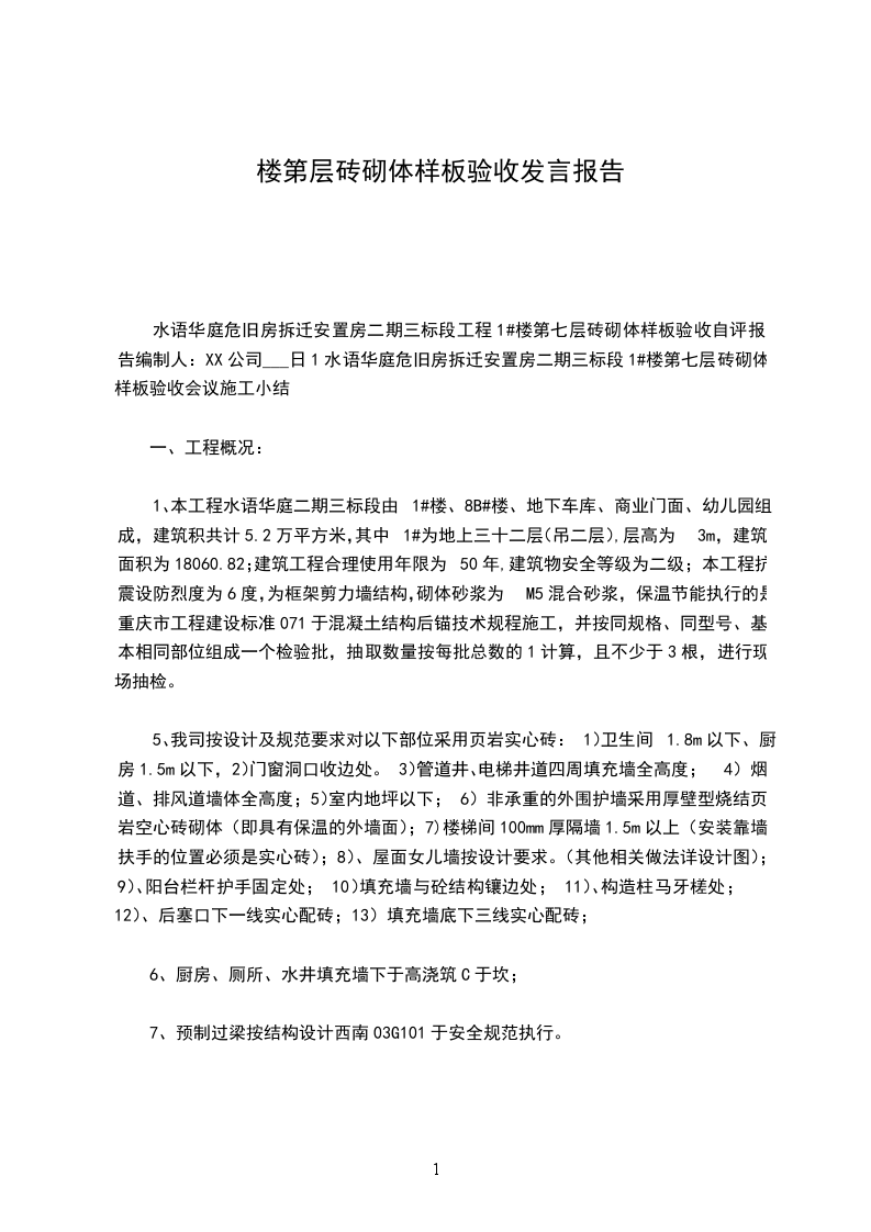 (4)砖砌体组砌施工:)先砌筑样板间,砌筑完成经过监理、建设单位检查验收合格后,将严格按样板间进行大面积施工。