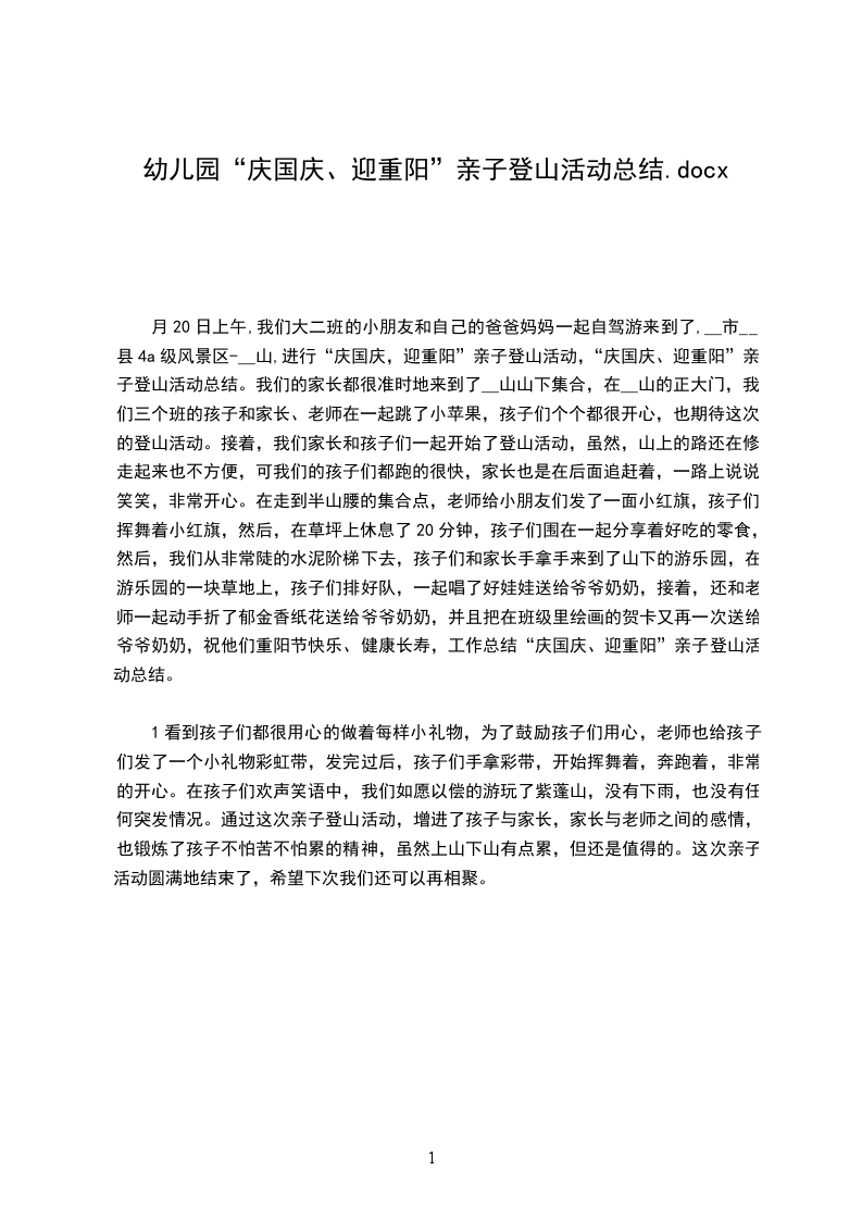 9月20日上午,我们大二班的小朋友和自己的爸爸妈妈一起自驾游来到了,__市__县4a级风景区-__山,进行“庆国庆,迎重阳”亲子登山活动,“庆国庆、迎重阳”亲子登山活动总结。我们的家长都很准时地来到了__山山下集合,在__山的正大门,我们三个班的孩子和家长、老师在一起跳了小苹果,孩子们个个都很开心,也期待这次的登山活动。接着,我们家长和孩子们一起开始了登山活动,虽然,山上的路还在修,走起来也不方便,可我们的孩子们都跑的很快,家长也是在后面追赶着,一路上说说笑笑,非常开心。在走到半山腰的集合点,老师给小朋友们发了一面小红旗,孩子们挥舞着小红旗,然后,在草坪上休息了20分钟,孩子们围在一起分享着好吃的零食,然后,我们从非常陡的水泥阶梯下去,孩子们和家长手拿手来到了山下的游乐园,在游乐园的一块草地上,孩子们排好队,一起唱了好娃娃送给爷爷奶奶,接着,还和老师一起动手折了郁金香纸花送给爷爷奶奶,并且把在班级里绘画的贺卡又再一次送给爷爷奶奶,祝他们重阳节快乐、健康长寿,工作总结“庆国庆、迎重阳”亲子登山活动总结。