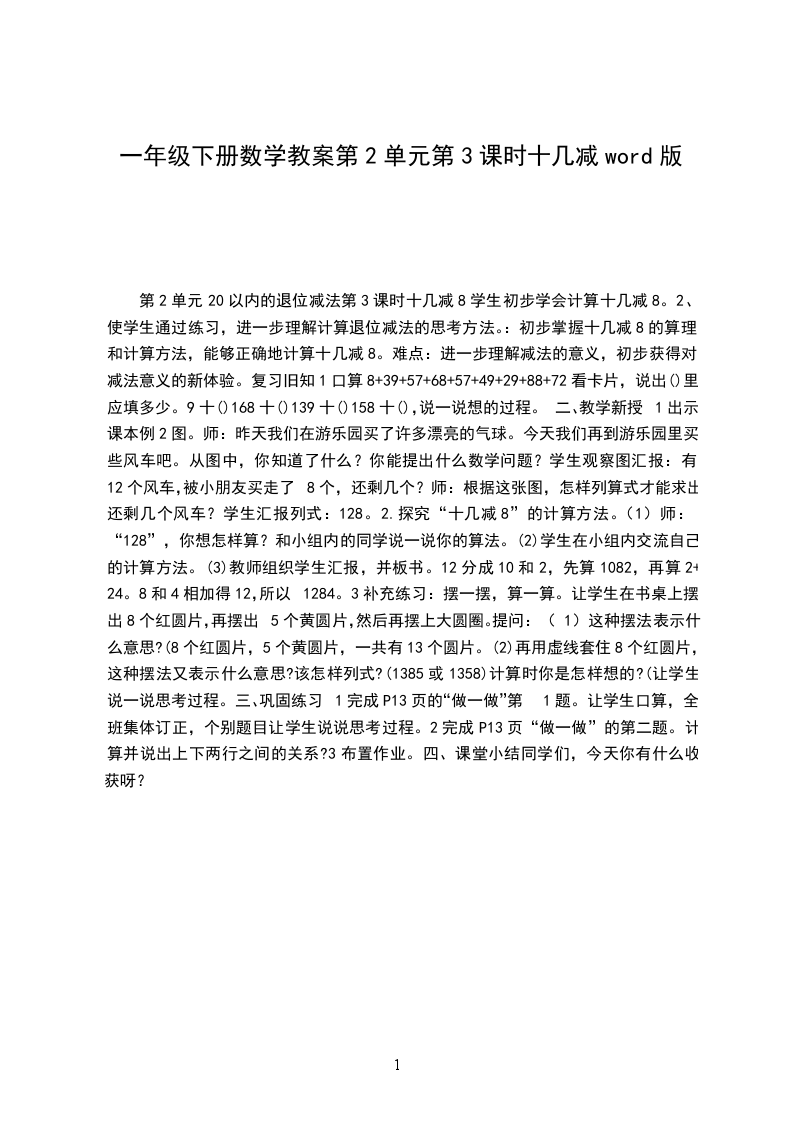 2、培养学生的观察能力、计算能力、提出问题和解决问题的能力。学习目标掌握十几减几的计算方法,能够比较熟练地进行口算。教学重点掌握十几减几的计算方法。教学难点能够比较熟练地进行口算。教学准备口算演示器,小棒等。教学过程与方法