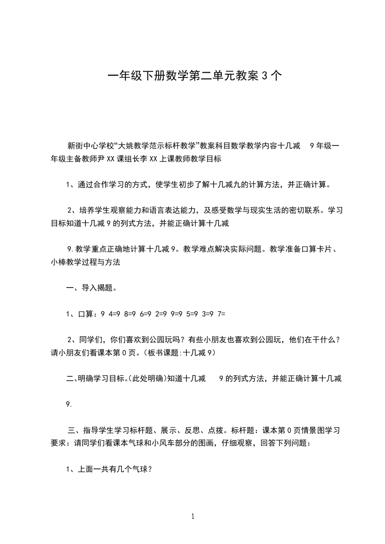 新街中心学校“大姚教学范示标杆教学”教案科目数学教学内容十几减9年级一年级主备教师尹XX课组长李XX上课教师教学目标