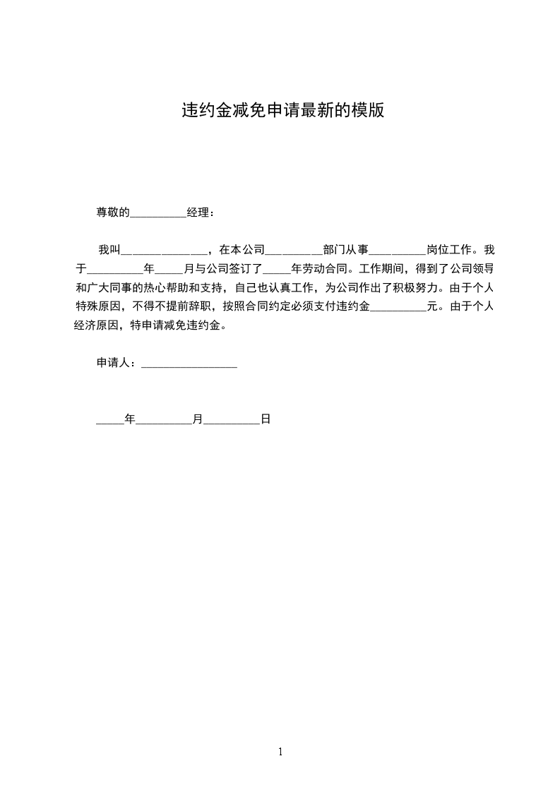 我叫_______________,在本公司__________部门从事__________岗位工作。我于__________年_____月与公司签订了_____年劳动合同。工作期间,得到了公司领导和广大同事的热心帮助和支持,自己也认真工作,为公司作出了积极努力。由于个人特殊原因,不得不提前辞职,按照合同约定必须支付违约金__________元。由于个人经济原因,特申请减免违约金。