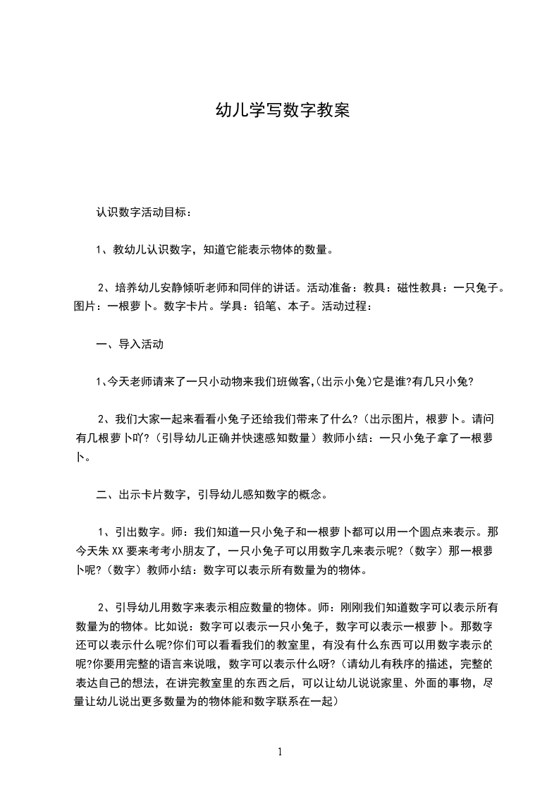 2、培养幼儿安静倾听老师和同伴的讲话。活动准备:教具:磁性教具:一只兔子。图片:一根萝卜。数字卡片。学具:铅笔、本子。活动过程: