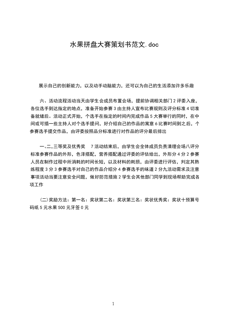 一、二,三等奖及优秀奖7活动结束后,由学生会全体成员负责清理会场八评分标准参赛作品的外形,色泽搭配,营养搭配通过评委的评估给出,外形分4分2参赛人员在制作过程中所消耗的时间长短,以及材料的耗损,由评委进行评估,判定其熟练程度3分3参赛选手对自己的作品介绍分4参赛选手的味道2分九活动需求及注意事项活动当要注意安全问题,做好防范措施2学生会其他部门同学到现场帮助完成各项工作