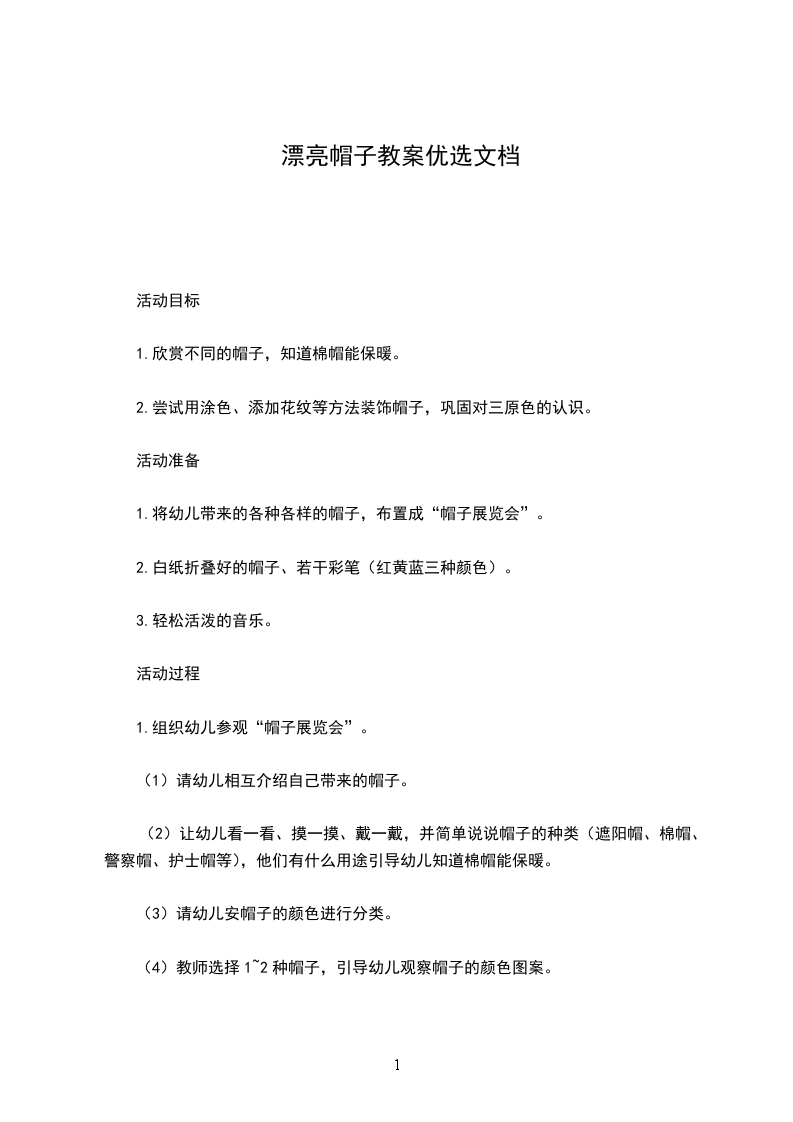 四、展示作品进行正面评价。师:我们的帽子秀就要开始了,请小模特们戴上自己的帽子,给我们展示一下吧。师:我们可以把这些漂亮的草帽送给农民伯伯,他们戴上这么漂亮的草帽一定会很开心的。教学反思:孩子们学习积极性高。但在开始作画时,相当一部分孩子不敢下笔,在老师的鼓励和引领后才纷纷动笔画。分析原因,平时锻炼机会不足,缺乏自信心所致,大家认为,活动时间太长,在这次活动中,教师的活动程序清晰有序,过程生动、有趣,方法得当。富于启发性、探究性,更重要的是教师的教态、语言、语气始终充满感染力,深深吸引着孩子们情绪愉快地积极、主动参与到活动中,因此,整个活动过程气氛活跃,效果理想。小百科:草帽一般是指用水草、席草、麦秸、竹篾或棕绳等物编织的帽子,帽檐比较宽。可用来遮雨,遮阳并且休息时将衣物放于帽中,以防沾尘土。简介草帽被沿用了数百年,直到现在,在广大的农村,它仍然是农民日常生活不可或缺的组成部分。