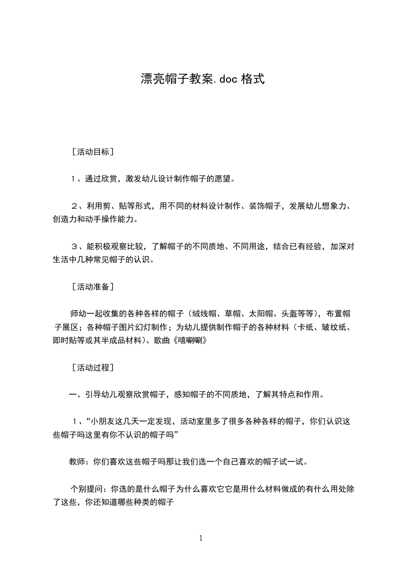 一、导入师:小朋友看看老师头上带的是什么?你见过吗?在哪里见过呀?引导幼儿讨论草帽的作用。(遮太阳,农民伯伯在田里劳动的时候太热了,就戴草帽遮阳,可以凉快一点)欣赏农民伯伯带着草帽劳动的场景。