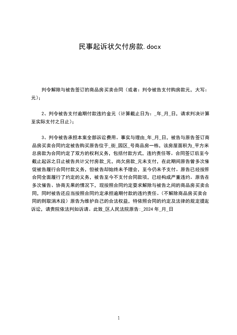 3、判令被告承担本案全部诉讼费用。事实与理由_年_月_日,被告与原告签订商品房买卖合同约定被告购买原告位于_街_园区_号商品房一栋,该房屋面积为_平方米,总房款为合同约定了双方的权利义务,包括付款方式,违约责任等。合同签订后至今,截止起诉之日止被告共计父付房款_元,尚欠房款_元未支付,在此期间原告曾多次催促被告履行合同付款义务,但被告却始终未予理会,至今仍未予支付。原告已经按照合同全面履行了约定的义务,被告至今不支付合同款项,已经构成严重违约。原告在多次催告、协商无果的情况下,现按照合同约定耍求解除与被告之间的商品房买卖合同,同时被告还应当按照合同约定承担逾期付款的违约责任。(不解除商品房买卖合同的则取消木段)原告为维护自己的合法权益,特依照合同的约定及法律的规定提起诉讼,请贵院依法判如诉请。此致_区人民法院原告:_2024年_月_日